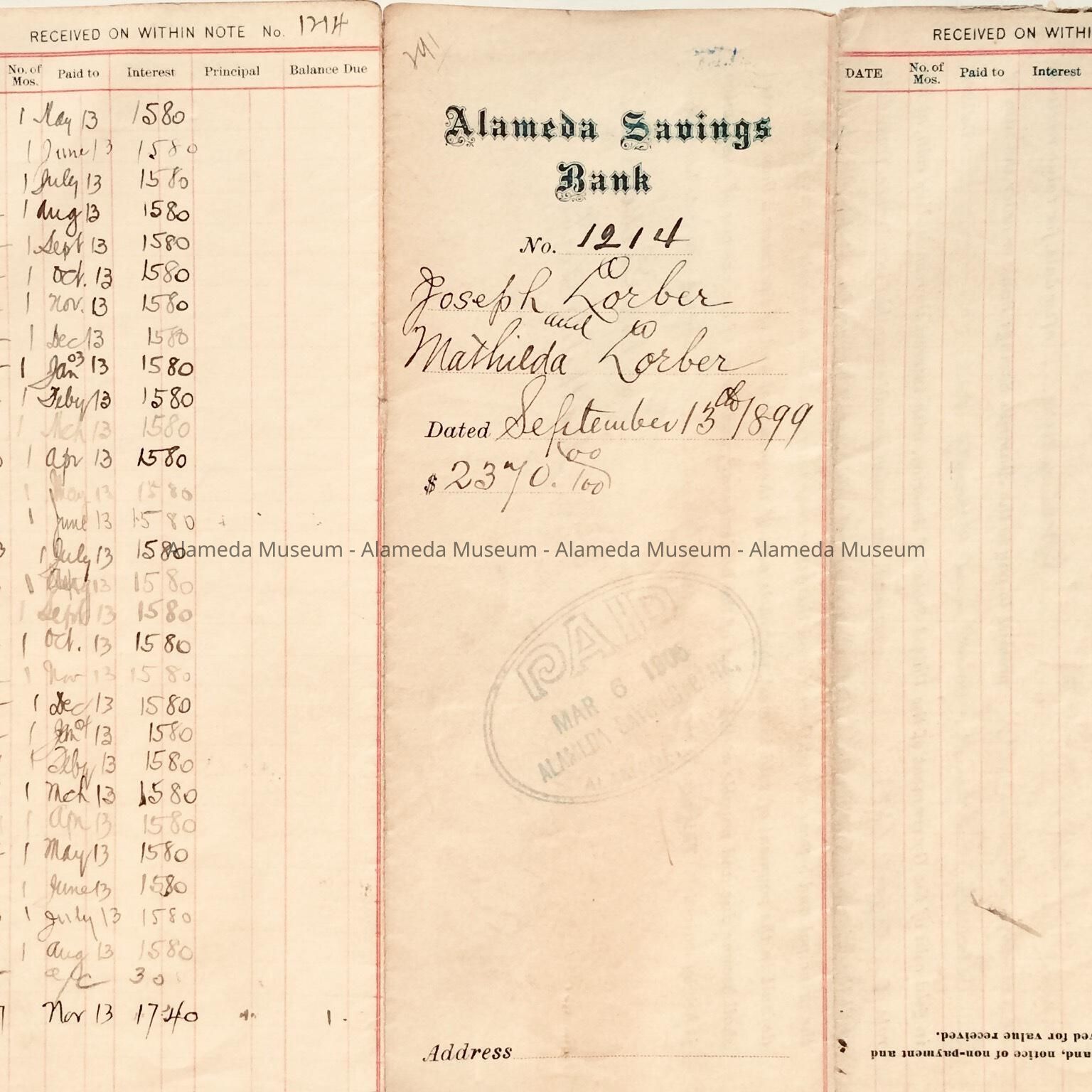 PAYMENT FORM FROM THE ALAMEDA SAVINGS BANK TO JOSEPH AND MATHILDA LORBER, DATED DECEMBER 8, 1899. THE FORM INCLUDES RECORD OF MONTHLY PAYMENTS TOWARD A LOAN MADE TO THEM BY THE BANK FOR $2,370.00.