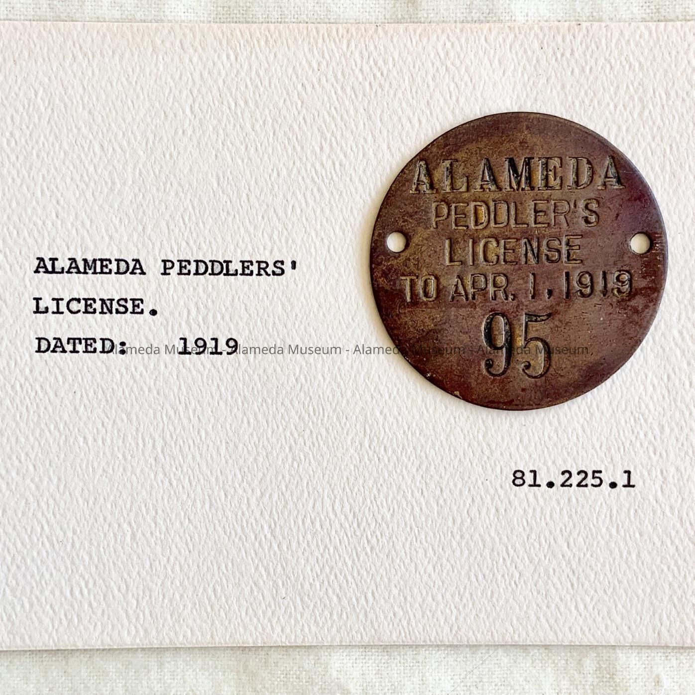 Description: It is a circular disc that is one and three-fourths in circumference. It is incised with lettering "Alameda Peddler's License to April 1, 1919. 95".