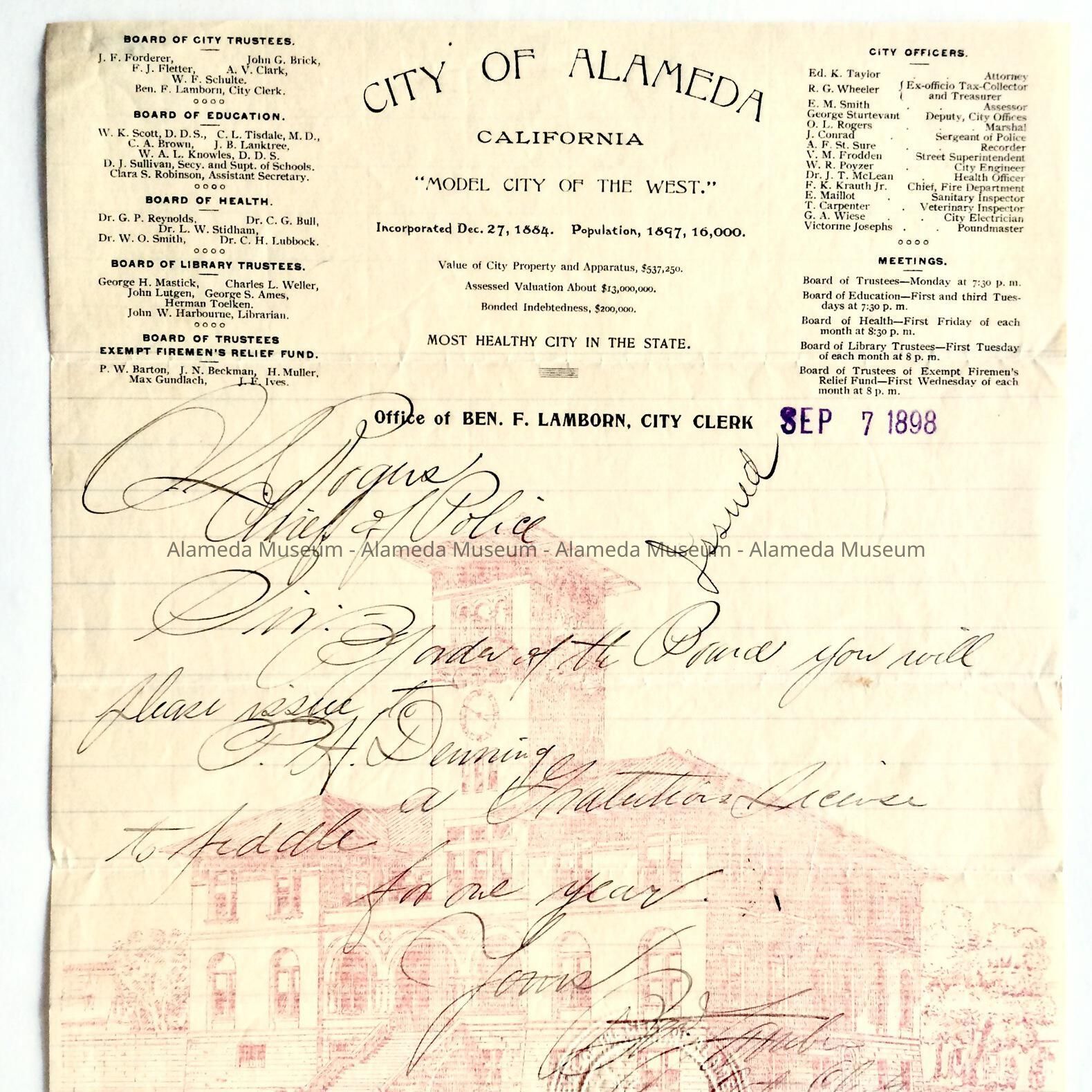 HISTORY OF OBJECT: THE STATIONERY IS FROM THE OFFICE OF BEN. F. LAMBORN, CITY CLERK, AND ADDRESSED TO ROGERS, CHIEF OF POLICE. REGARDING THE GRANTING OF A GRATUITOUS LICENSE TO PEDDLE TO C. H. DENNING, FOR ONE YEAR. SIGNED BY LAMBORN.