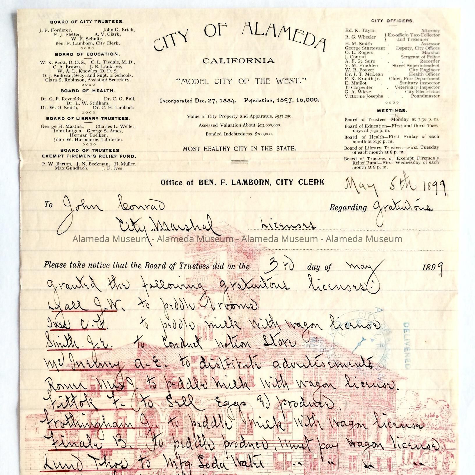 HISTORY OF OBJECT: THE STATIONERY IS FROM THE OFFICE OF BEN F. LAMBORN, CITY CLERK, AND ADDRESSED TO JOHN CONRAD, CITY MARSHAL. CONCERNING THE GRANTING OF GRATUITOUS LICENSES TO 11 PEOPLE TO PEDDLE GOODS IN ALAMEDA. SIGNED BY LAMBORN.