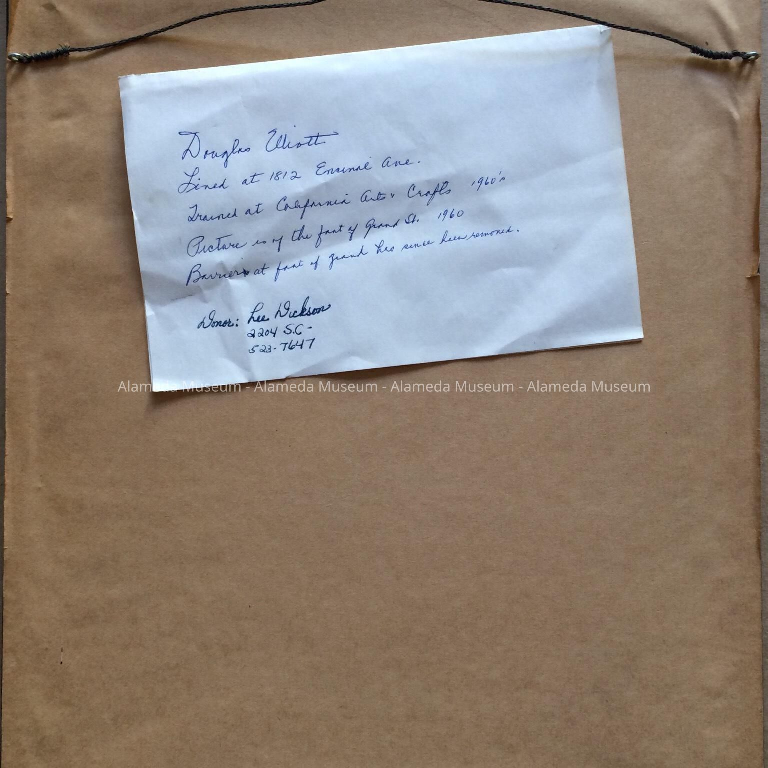 Encinal Avenue, Alameda. He trained at the California College of Arts & Crafts in the 1960's. The drawing (stylized) depicts a barrier at the foot of Grand Street, which has since been removed.