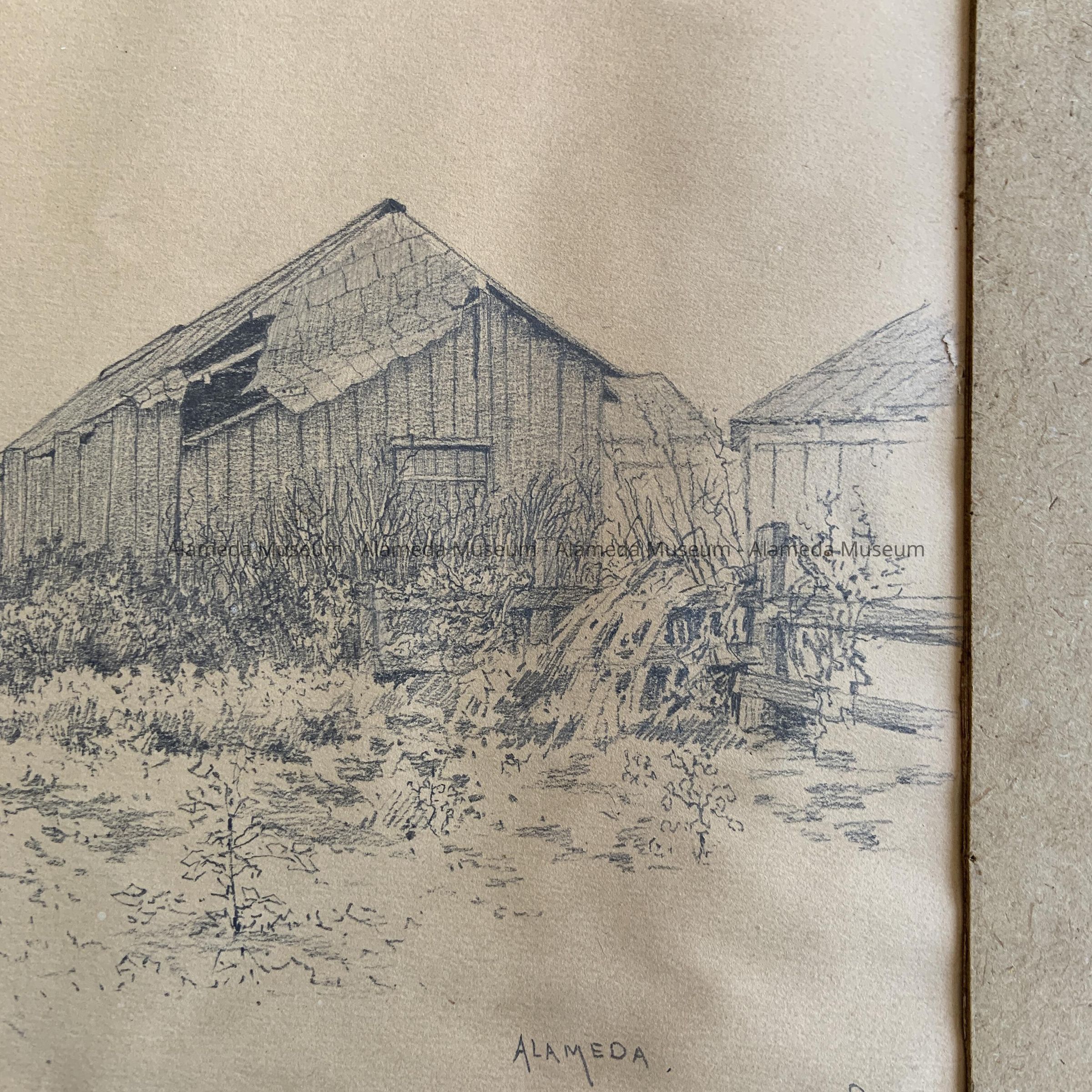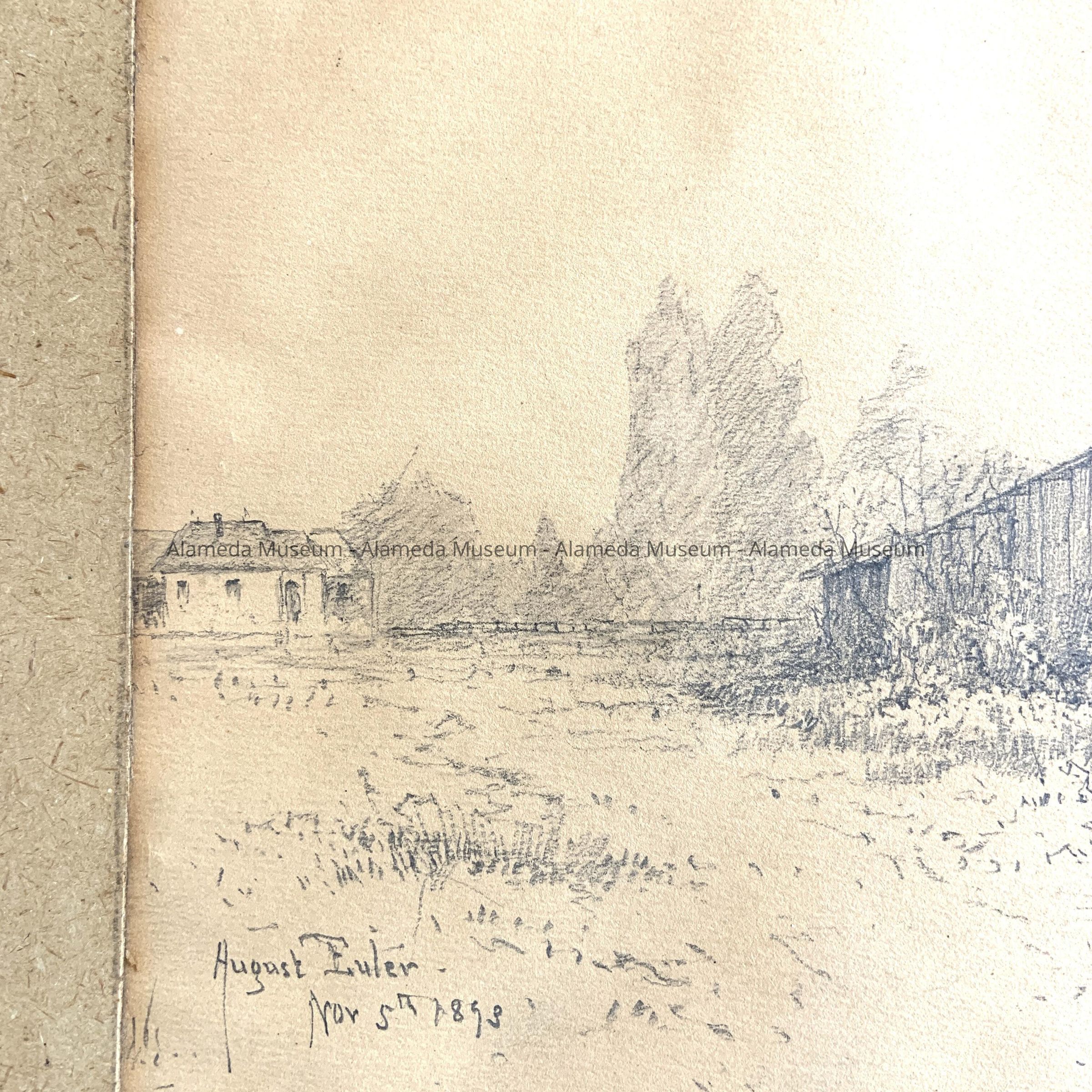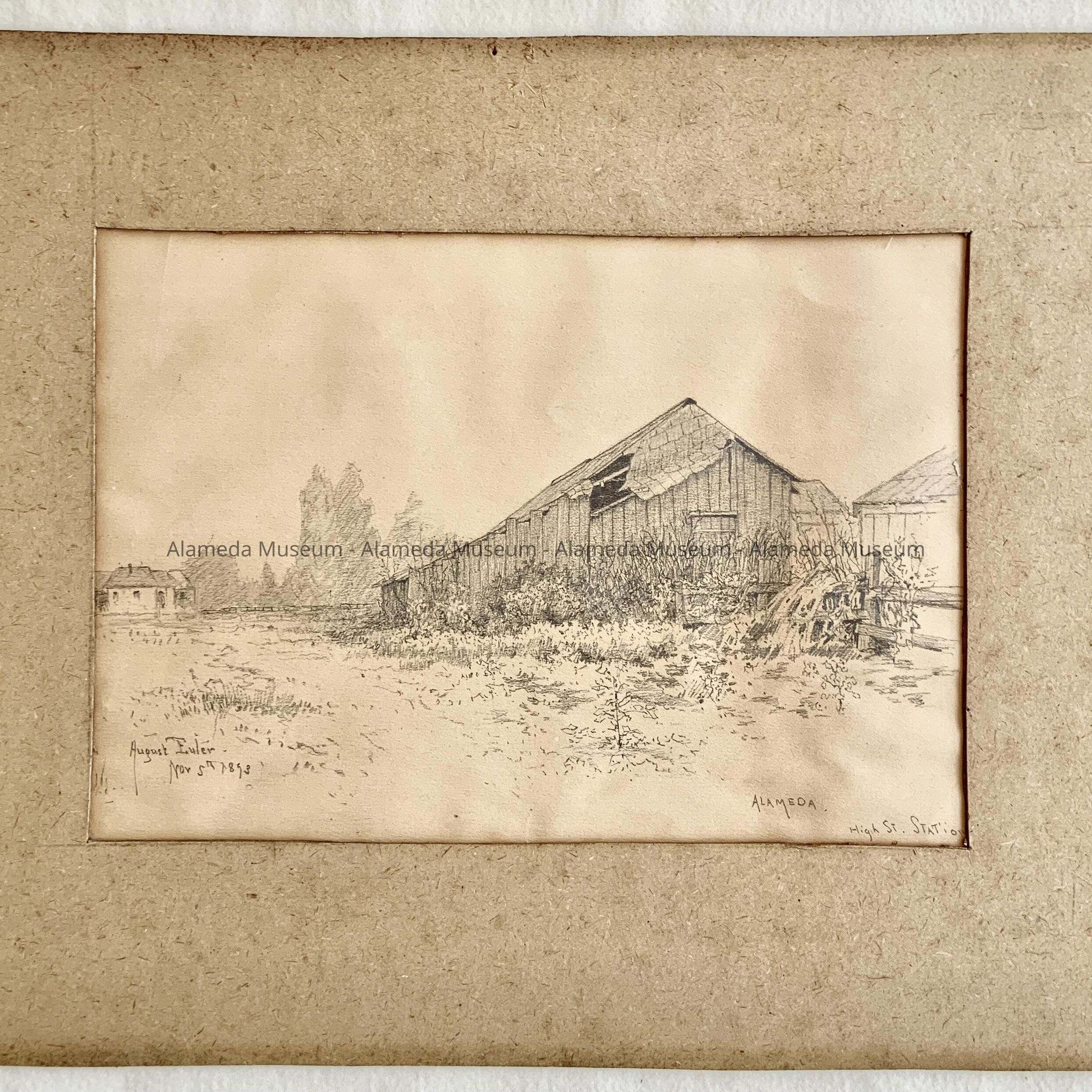 Original pencil sketch on paper. Subject appears to be a dilapidated barn. Artist signature on the left-hand corner, "August Euler, Nov. 5th, 1893." On the right-hand side, lower bottom, "Alameda High Street Station." The penciled sketch is matted with tan-colored cardboard.
