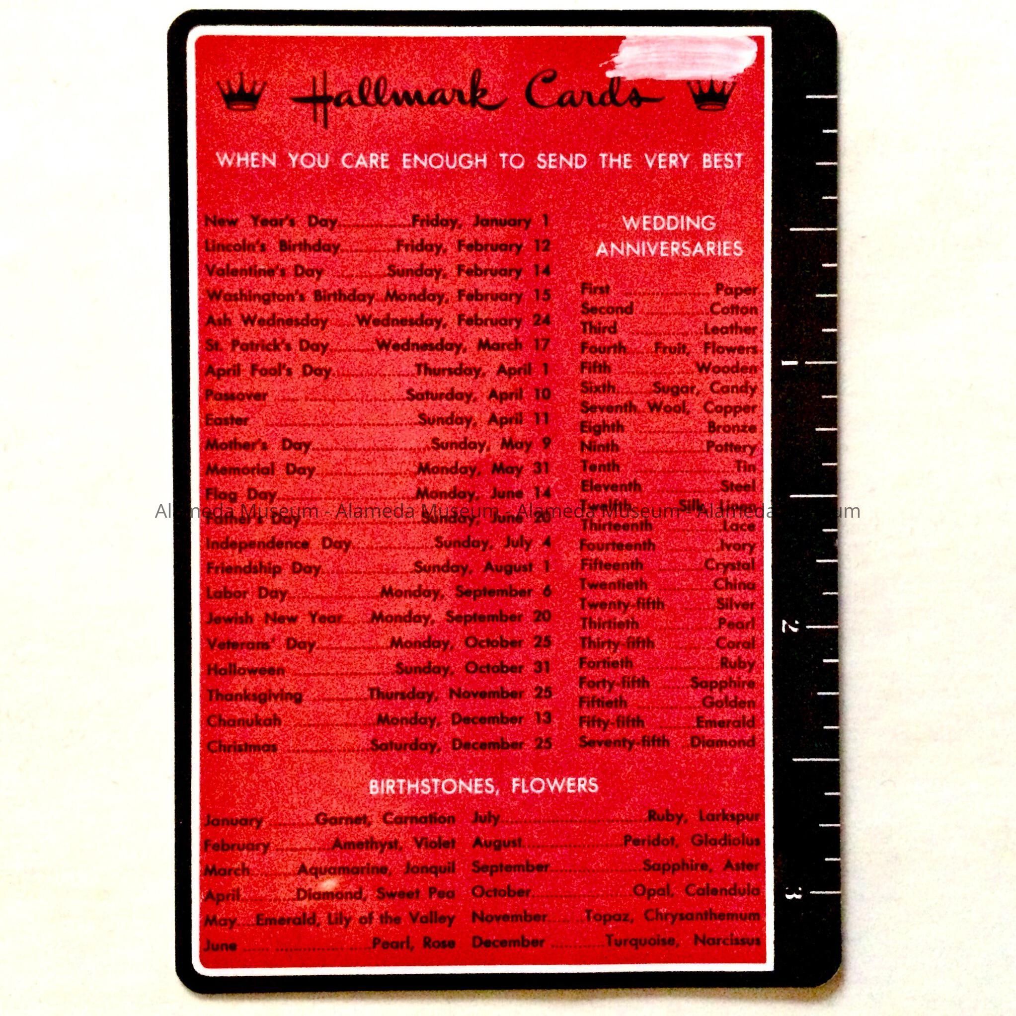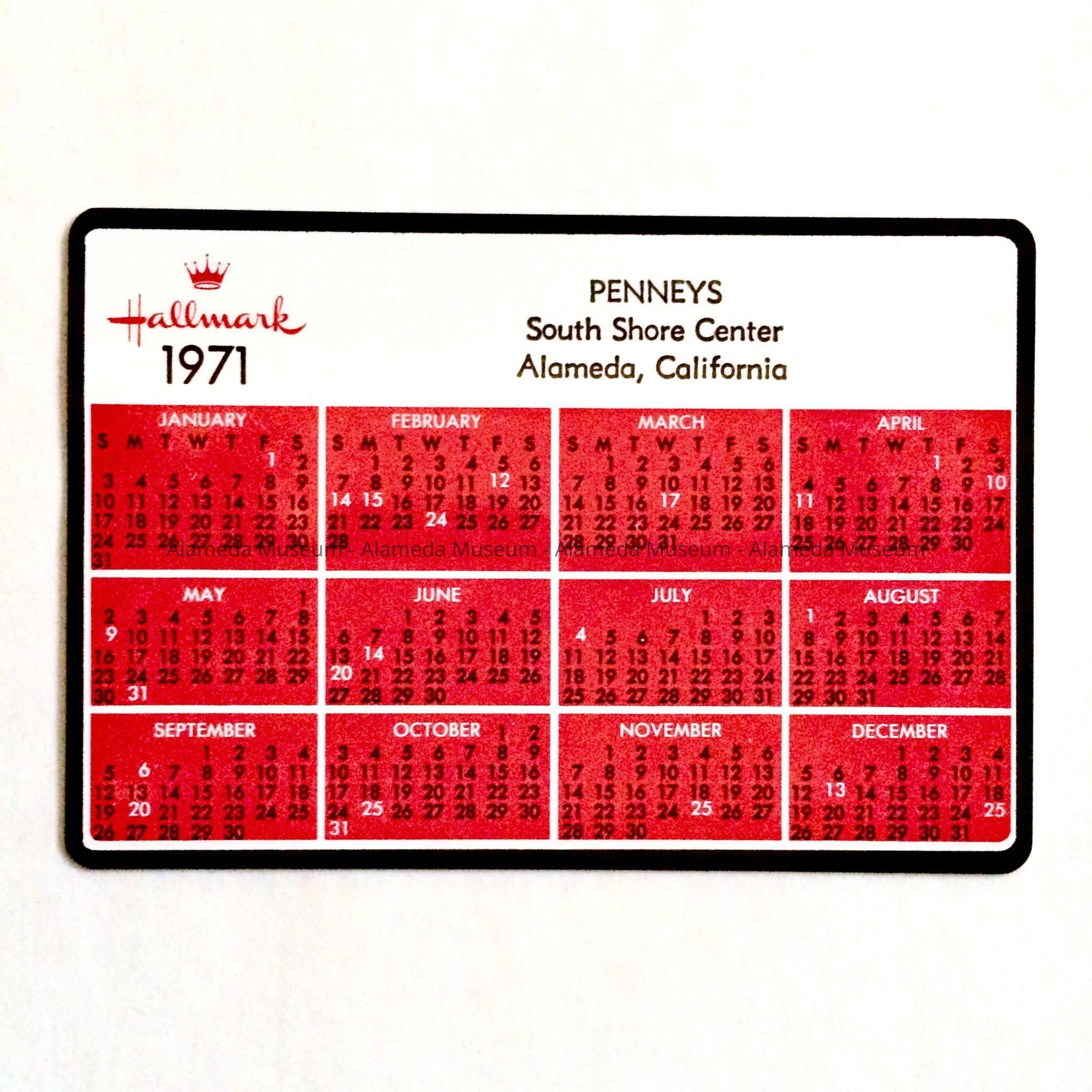 Description: plasicized card, in white, red and black, with on one side a calendar, with the year and store information stating ‘Penneys, South Shore Center, Alameda, California’.