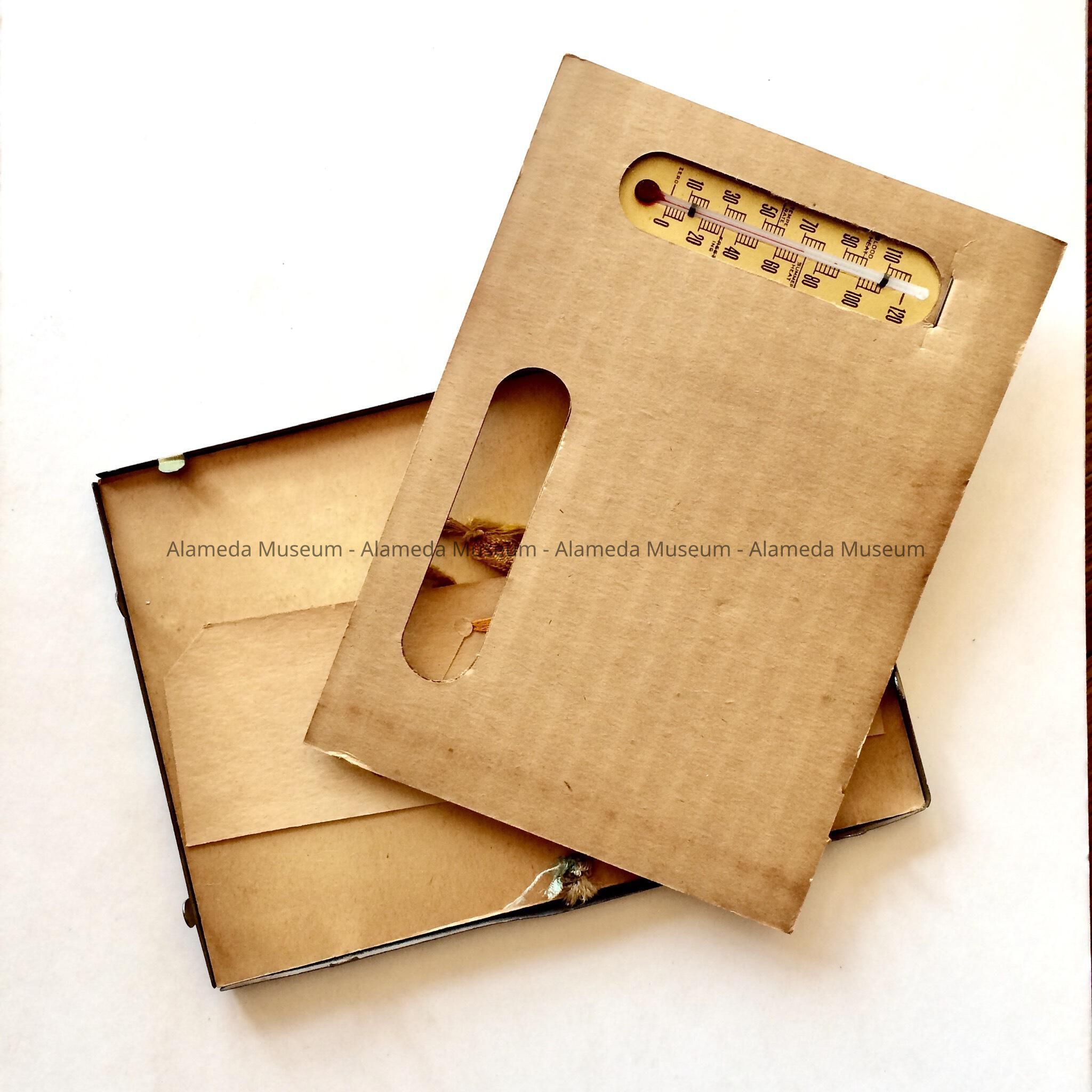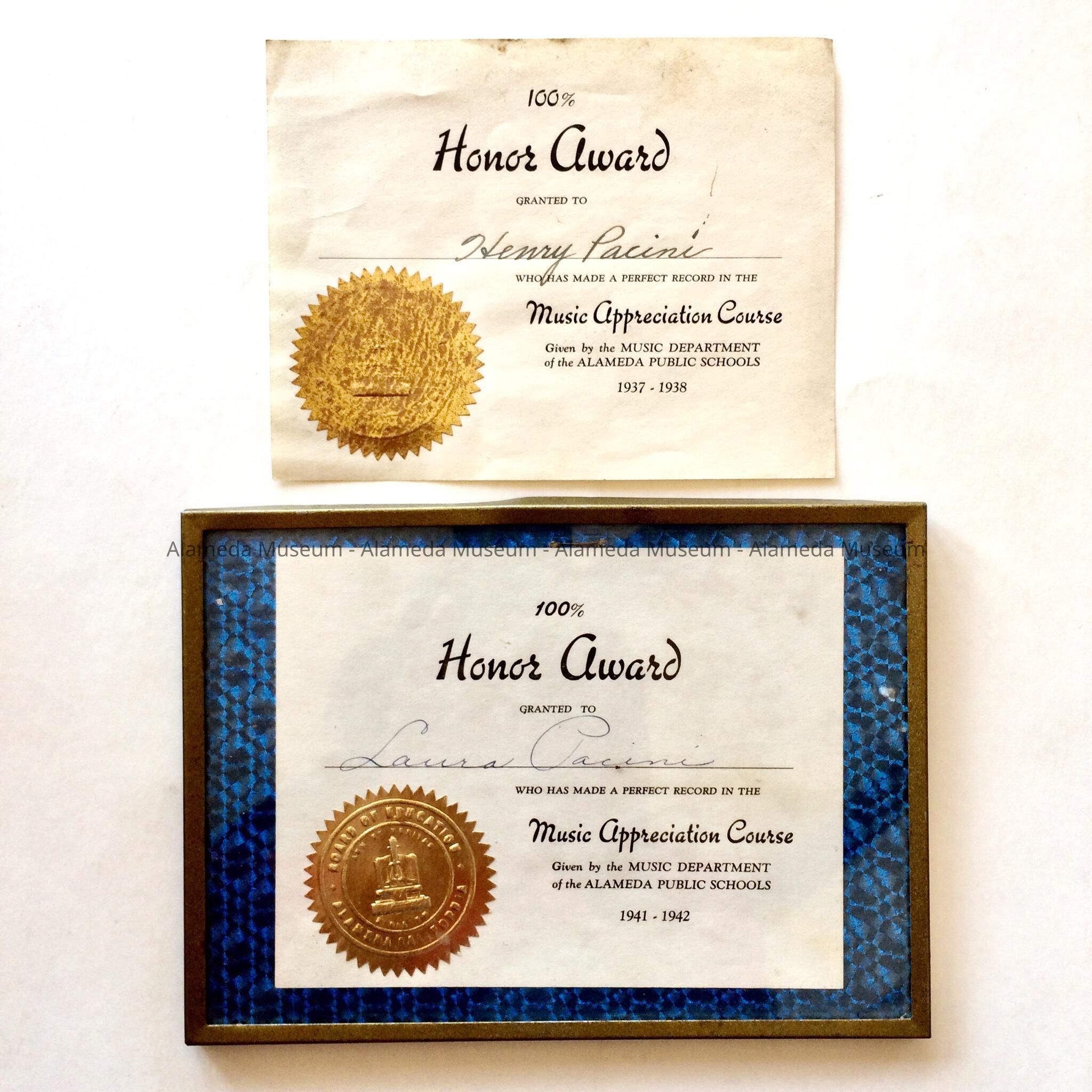 Description: Two Certificates titled '100% Honor Award' for perfect record in the 'Music Appreciation Course given by the Music Department of the Alameda Public Schools'. A. unframed, is granted to Henry Pacini, 1937-1938, B. framed in a gold-painted metal frame with blue metallic paper backing, granted to Laura Pacini, 1941-1942. Cardboard backing includes a stapled-in thermometer mounted on card stock, facing inward.