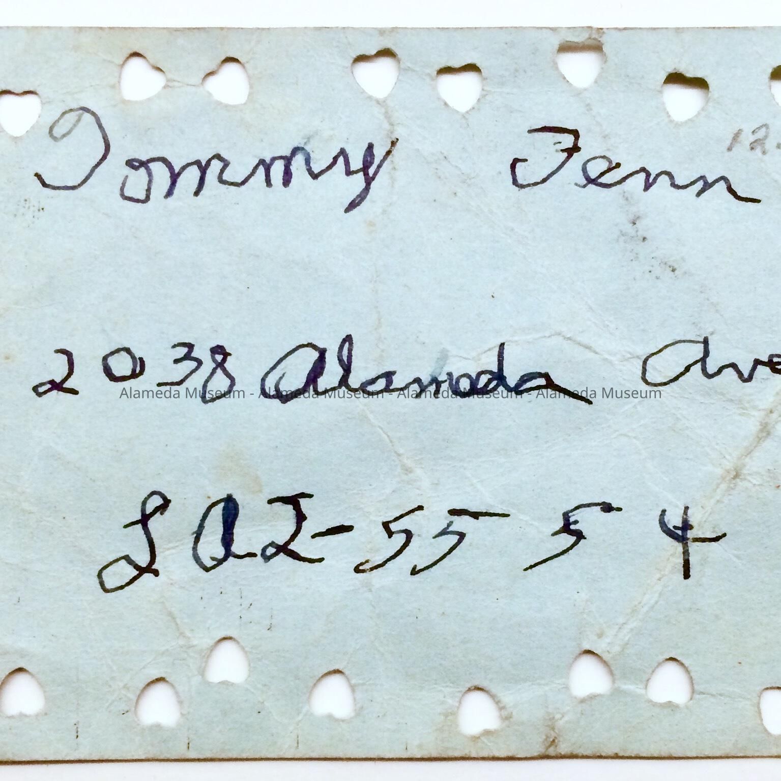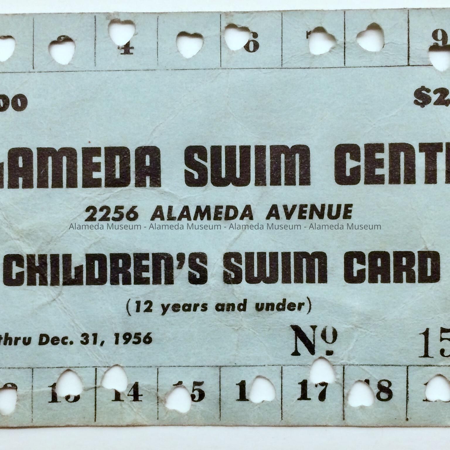 HISTORY OF OBJECT: A PERFORATED CARD FROM 1956 FOR DAILY SWIMMING AT THE ALAMEDA SWIM CENTER, 2256 ALAMEDA AVENUE, ALAMEDA ISSUED TO TOMMY FENN, SON OF HELGA AND CHESTER FENN, 2038 ALAMEDA AVENUE, ALAMEDA.