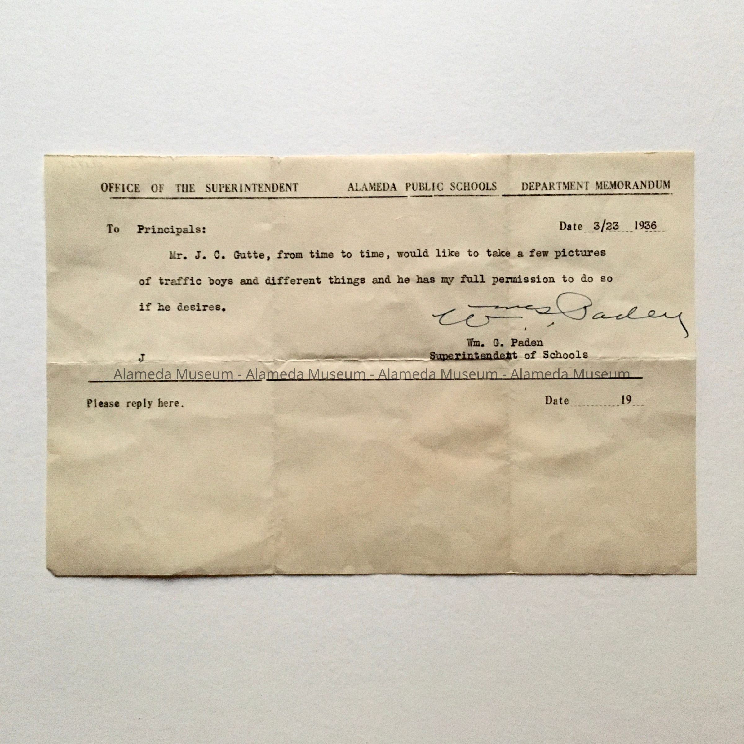 PERMISSION SLIP SIGNED BY WILLIAM G PADEN, SUPERINTENDENT OF SCHOOLS, DATED MARCH 23, 1936. PERMISSION PRESENTED TO JACK C GUTTE, AUTHORIZING HIM TO TAKE PHOTOS OF TRAFFIC BOYS AND OTHER SCHOOL FUNCTIONS, ALAMEDA PUBLIC SCHOOLS.