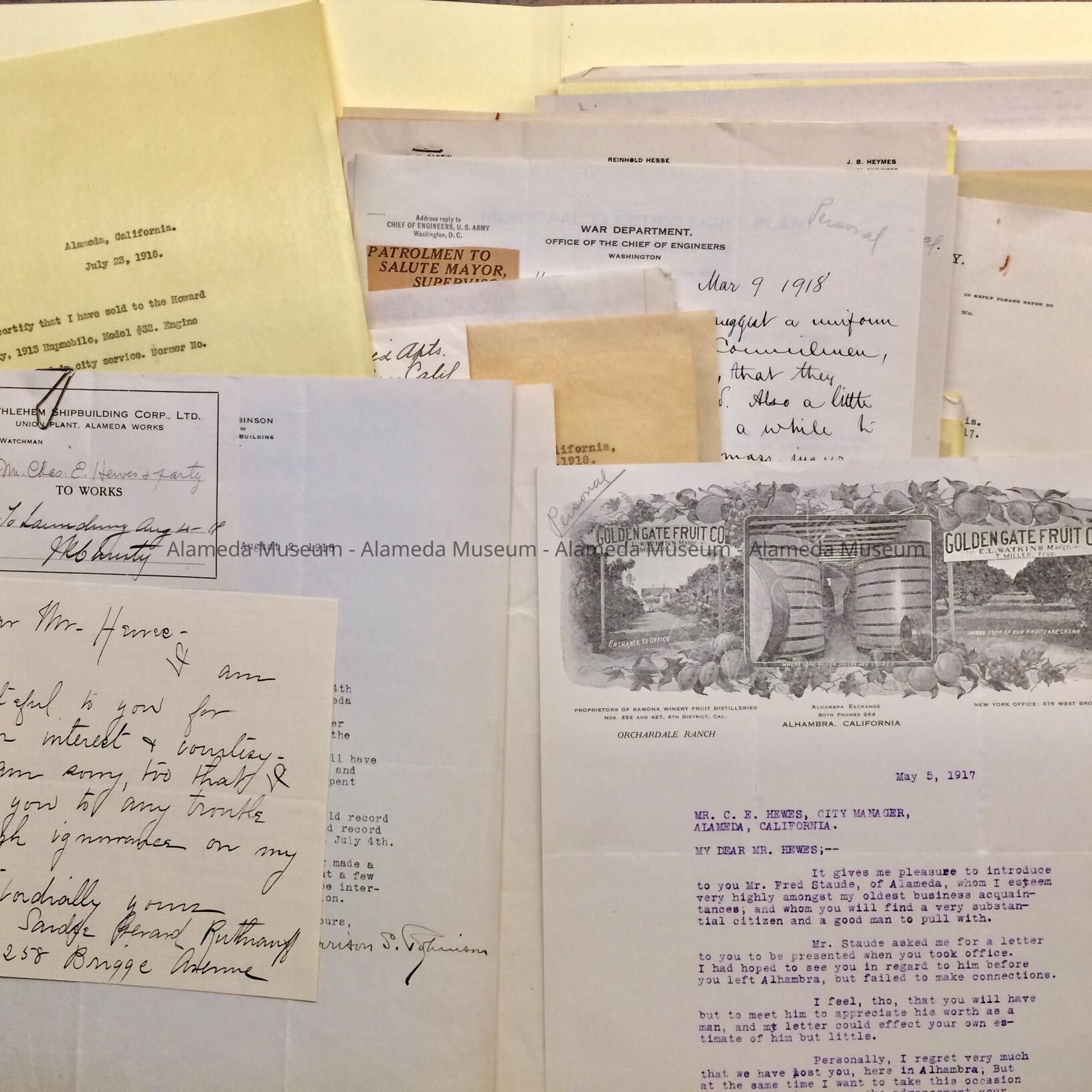History of Object: Documents found in the attic of City Hall prior to renovations in the 1990s. Documents were in a crumbling legal-size folder; replaced by a new folder, 2020. Most documents are marked ‘Personal’ in pencil, and appear to be ‘networking’ type communications to/from the City Manager, Charles E. Hewes: letters of introduction, some invitations, thank-you notes for loaned documents, sharing of salary information, equipment, or ordinances with other cities, for instance a Sample Ballot from Pasadena, but in many cases exchanges with the City Manager of the City of Alhambra. From these documents it appears Mr. Hewes appears to have been in favor of a City-County type of government. Also of interest is an undated, unsigned, letter from Franklin D. Roosevelt, Assistant Secretary of the Navy, indicating a piece of equipment (of type ‘binoculars, telescopes, spyglasses, and other navigational instruments’) was loaned and is being returned, with promise of a certificate to follow.