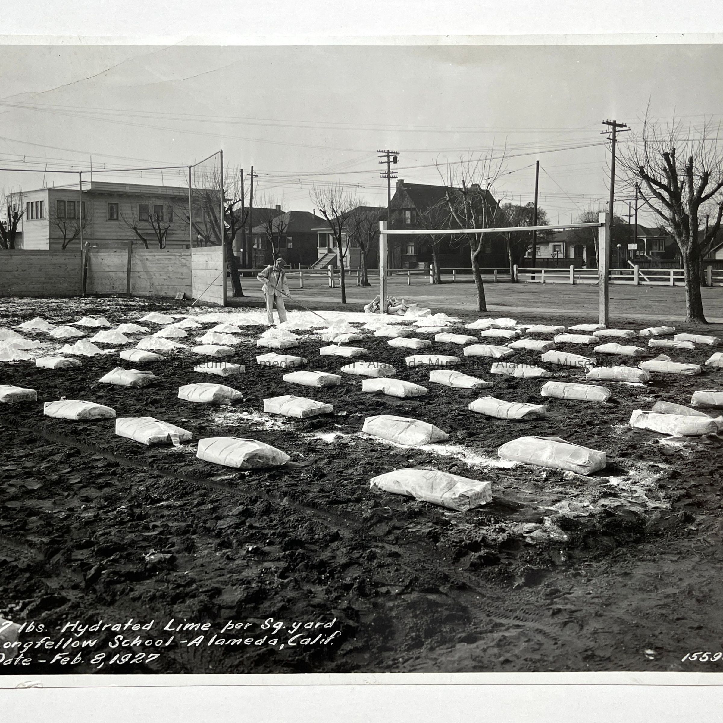 History of Object: Photo depicting lime being spread on the Longfellow School grounds, Alameda.