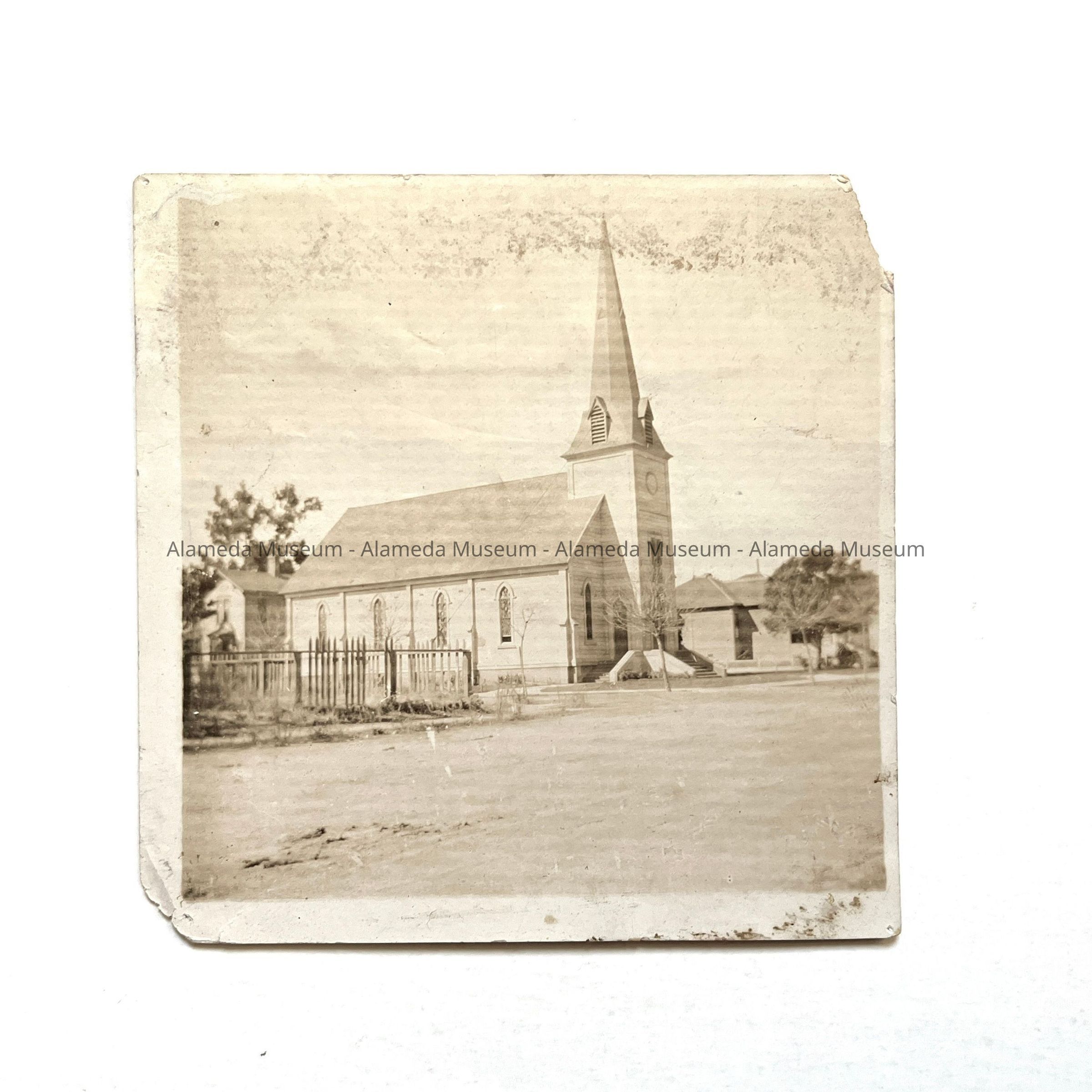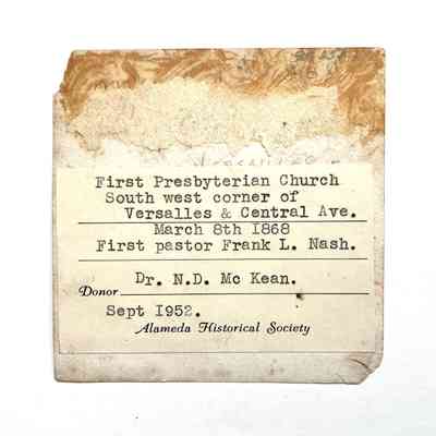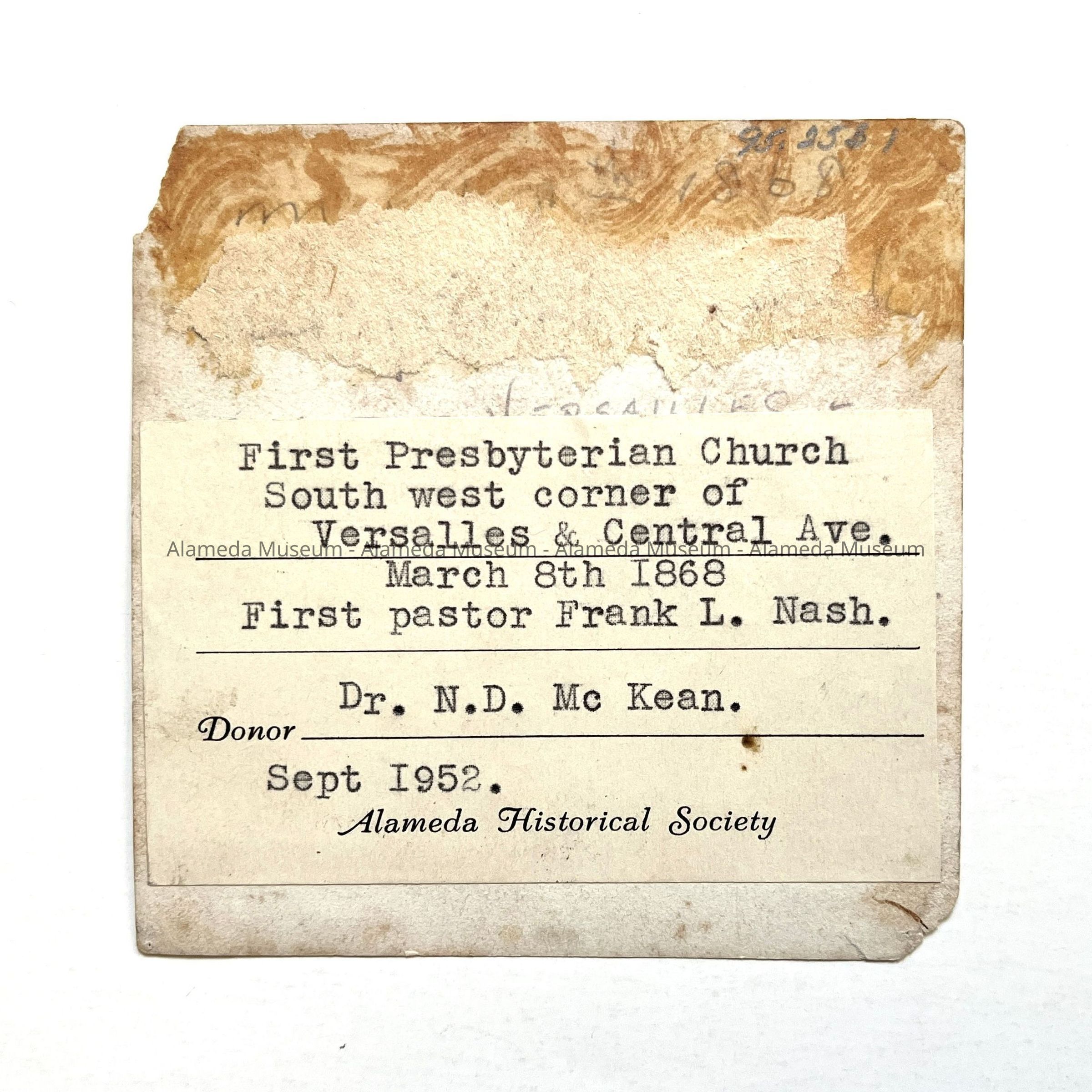 History of Object: View of the 1st Presbyterian Church when located at the S.W. corner of Versailles and Central Aves. This congregation was established on March 8, 1868; the first pastor was the Rev. Frank L. Nash (per info. on verso).