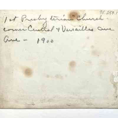 History of Object: View of the 1st Presbyterian Church when located at the S.W. corner of Versailles and Central Aves.