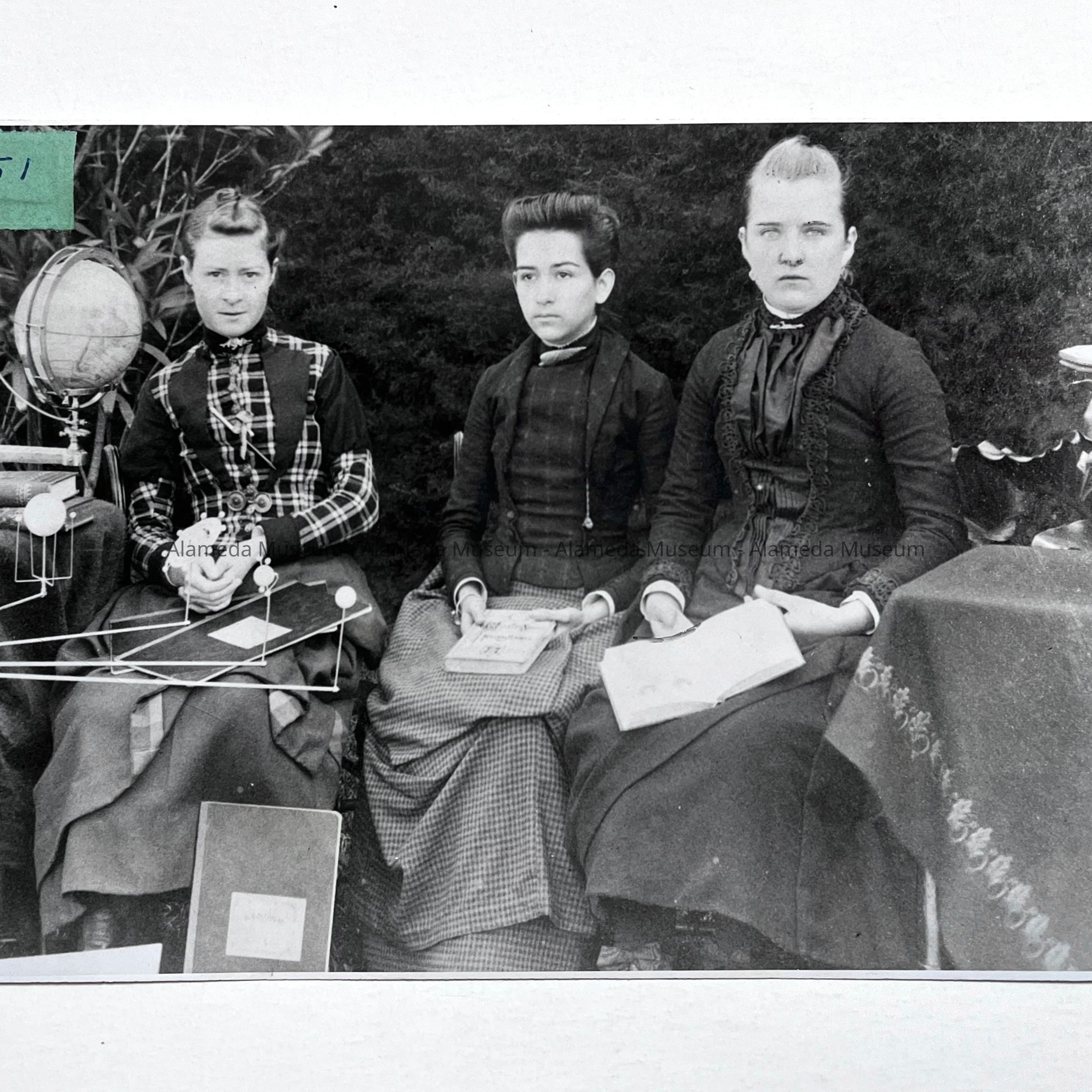 History of Object: "1st Rhetoric Class", showing three female students posed among globes, reference books and scientific equipment.