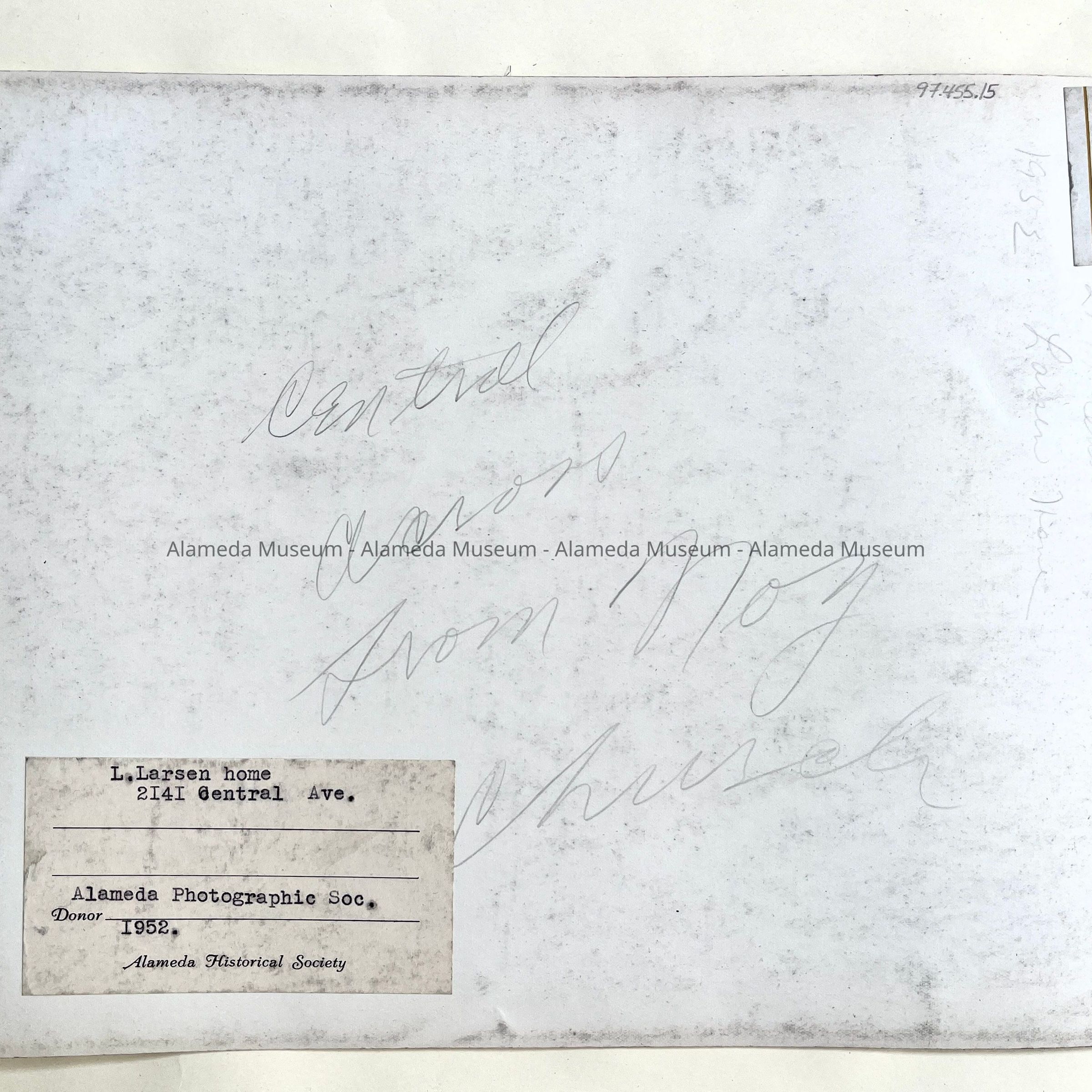Photograph depicting the main facade of 2141 Central Avenue, an Italianate-style cottage with a high basement. Erected in 1876 for Captain Lewis Larson, Master Mariner, and still standing. Photograph was taken by Harriet Hallonquist, a member of the Alameda Photographic Society.