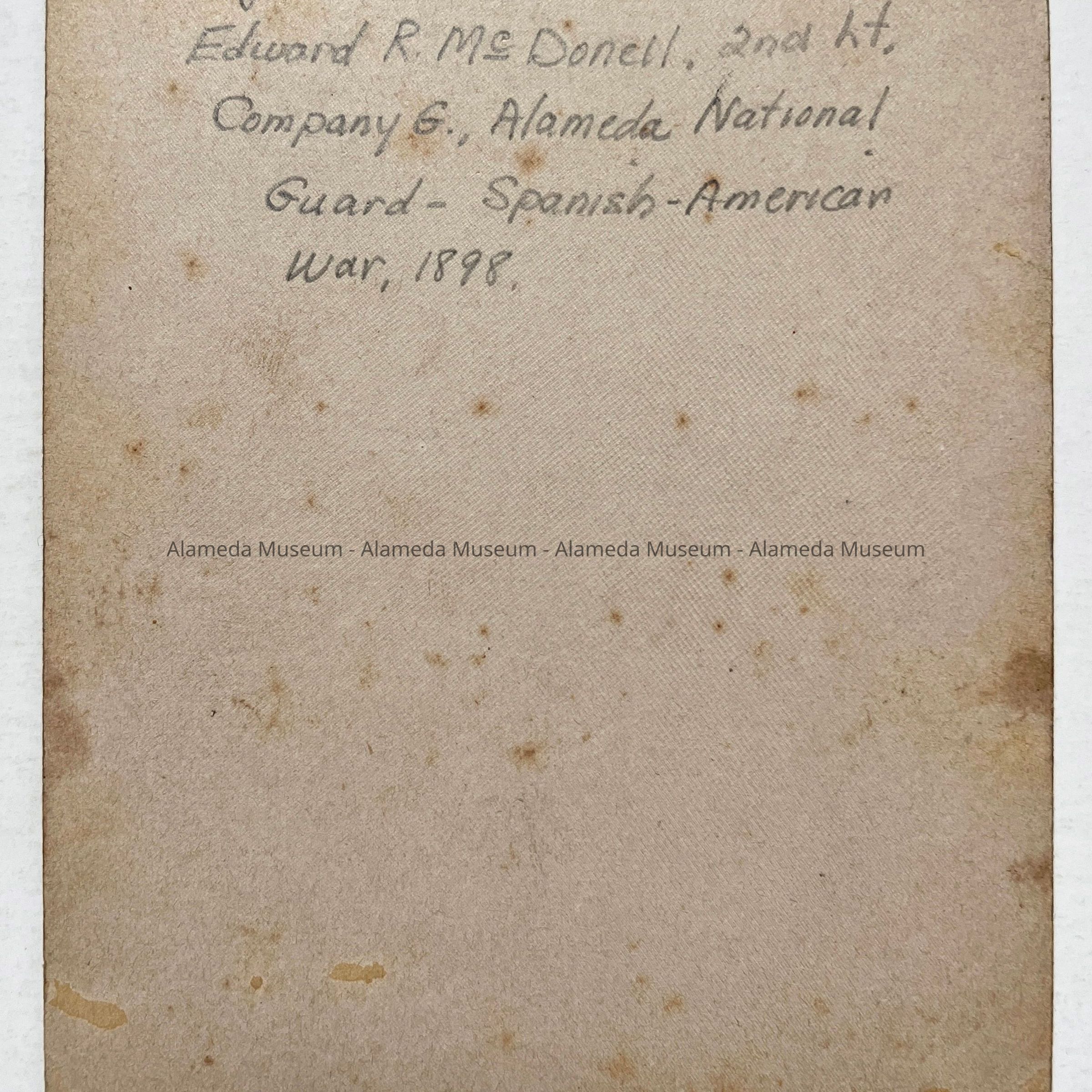 Photo of 2nd. Lt. Edward R. McDonell, Company G., Alameda National Guard, in training camp (possibly Fort Lewis, Washington), during the Spanish American War.