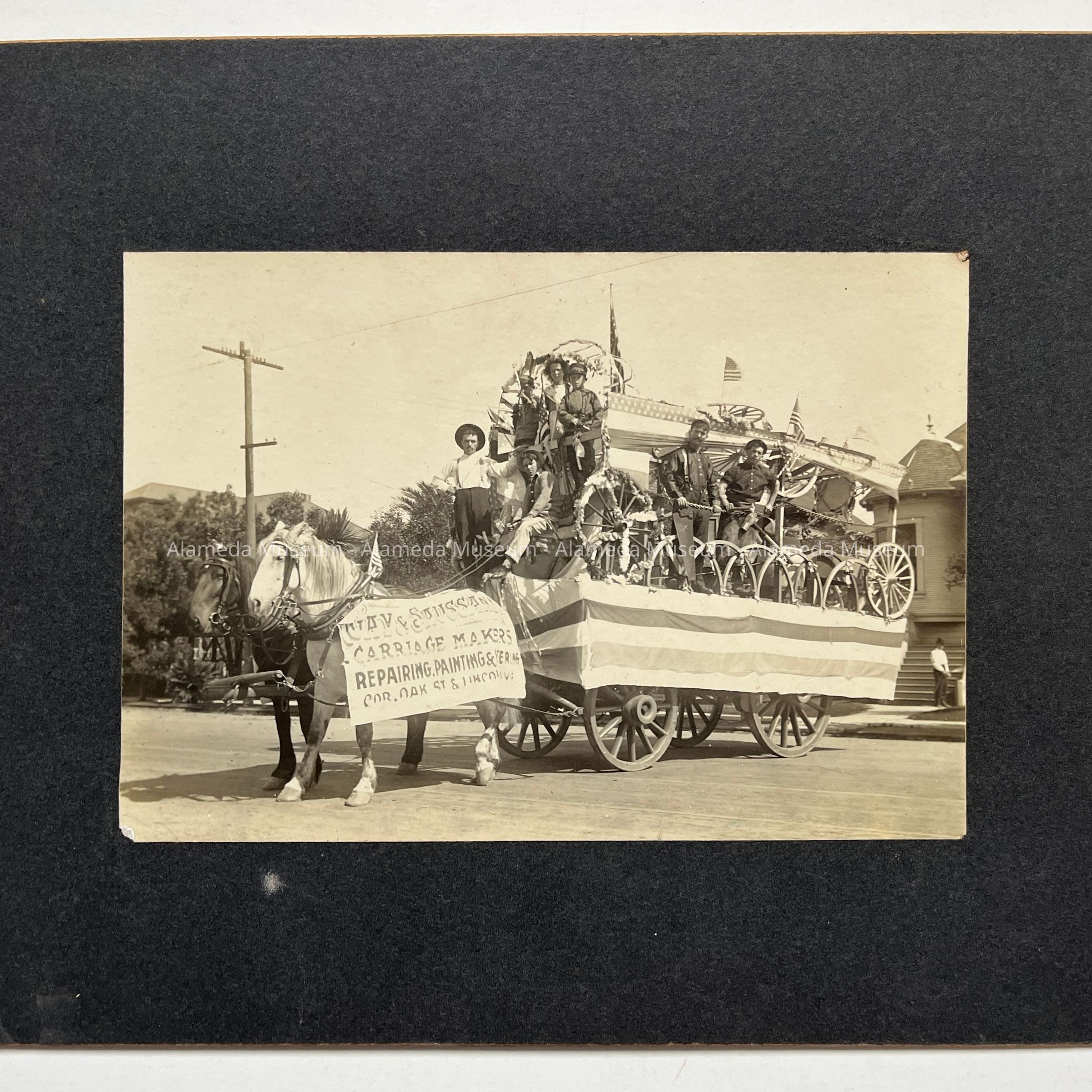 Photo depicting a 4th of July horse drawn float of Gay & Saussano, Carriage Makers, corner Oak Street & Lincoln Avenue, Alameda. Individuals riding on float are unidentified.