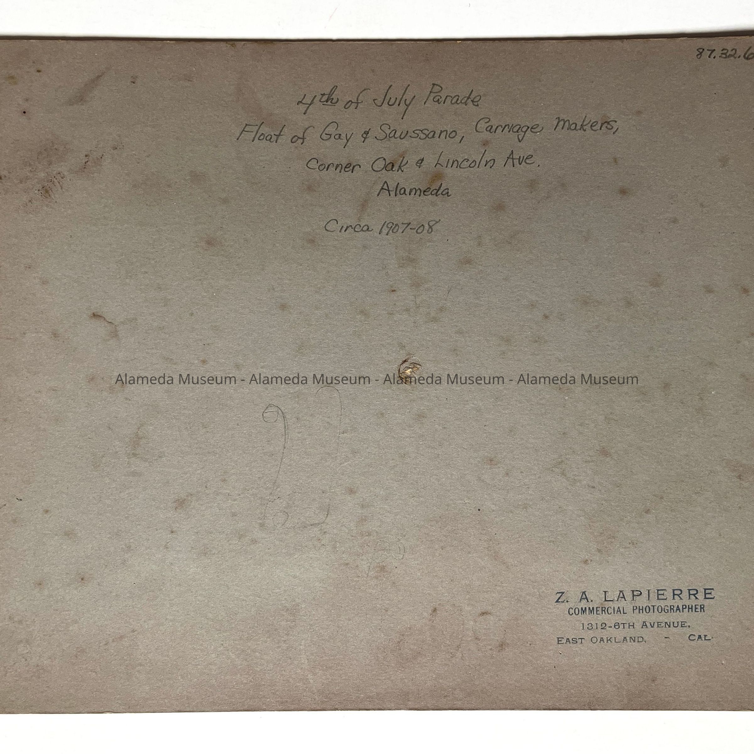 Black & white photo on charcoal grey colored mounting. Signed on the reverse side “Z. A. Lapierre, Commercial Photographer, 1312 6th Avenue, East Oakland, Cal."