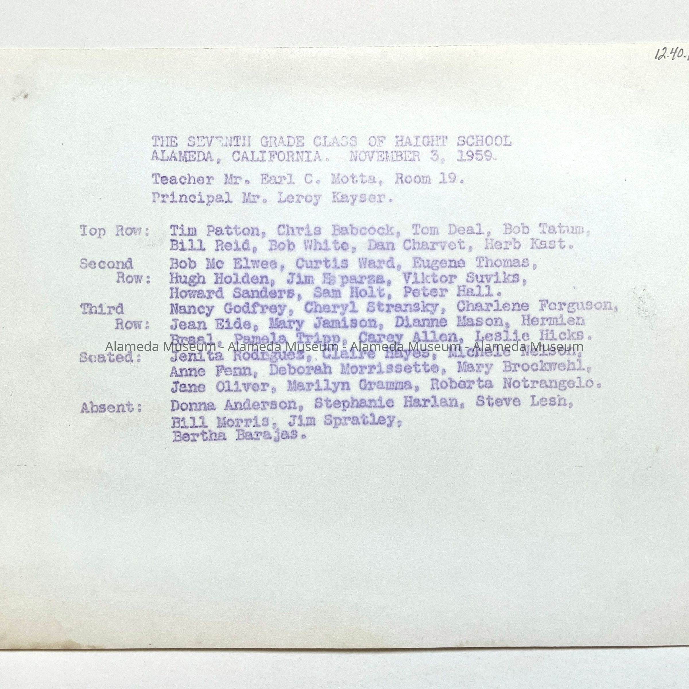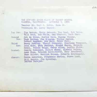Photo 7th grade class, Haight School, 1959Entry/Object ID