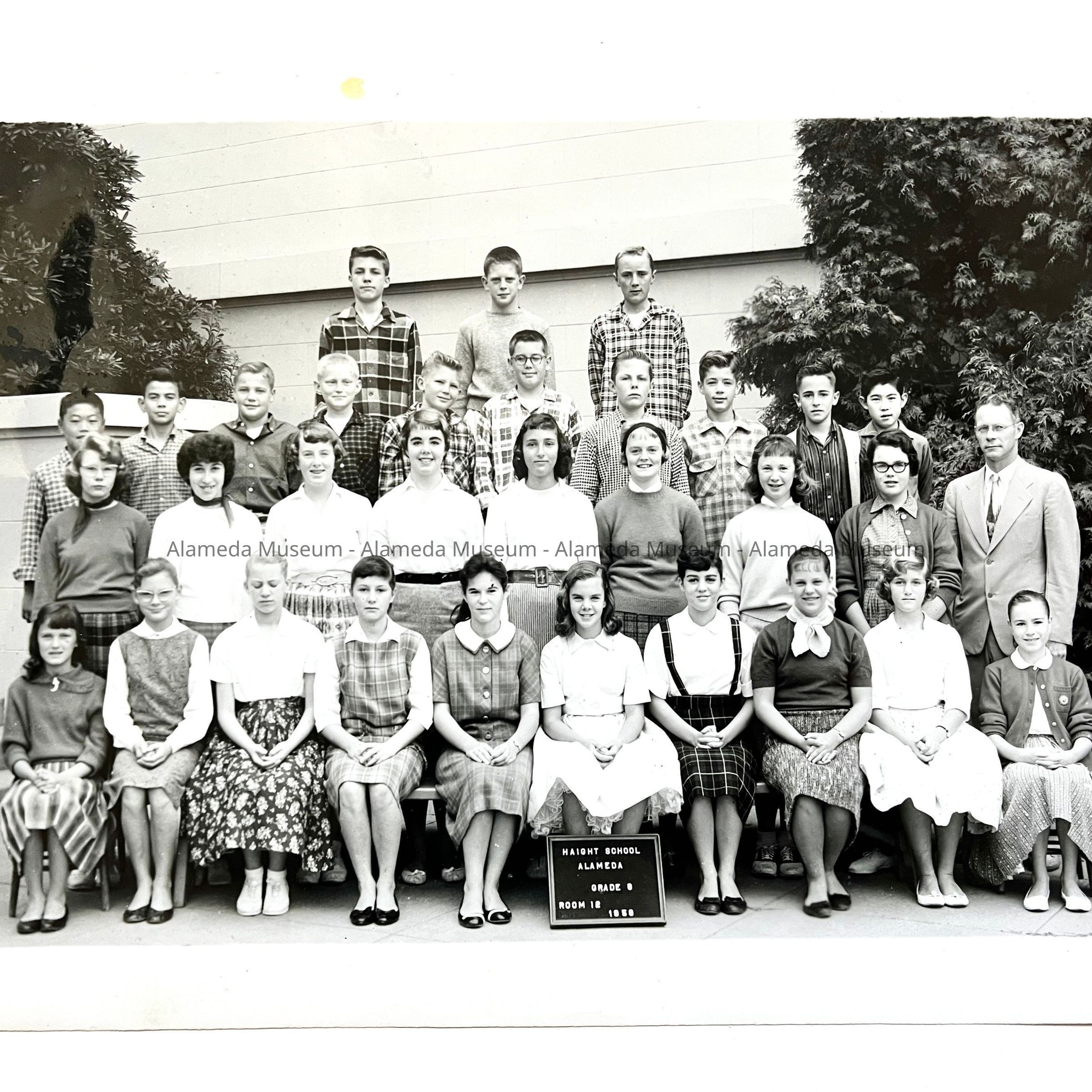 History of Object: Photo of eighth grade class of Haight School in 1958, with Thomas Fenn, resident of 2038 Alameda Avenue, as a member.