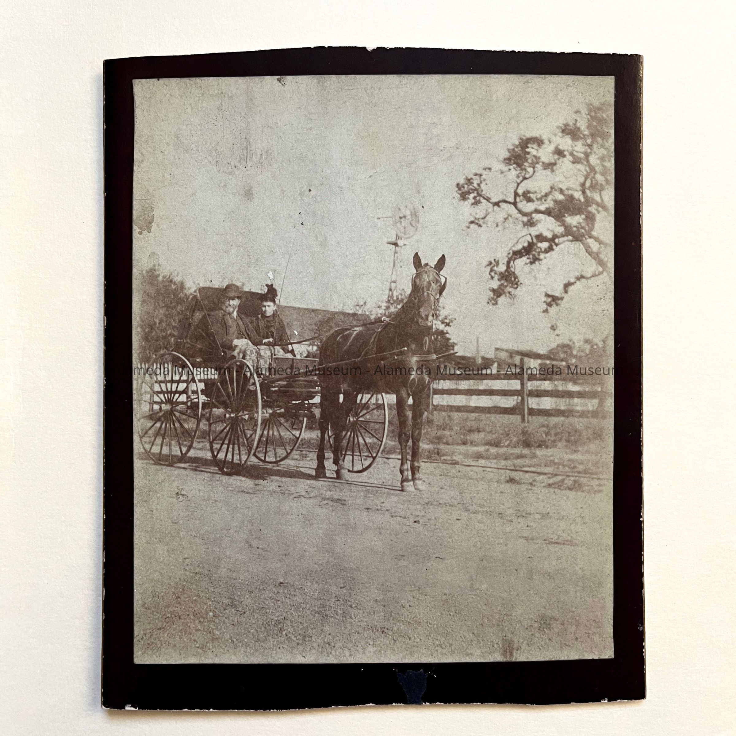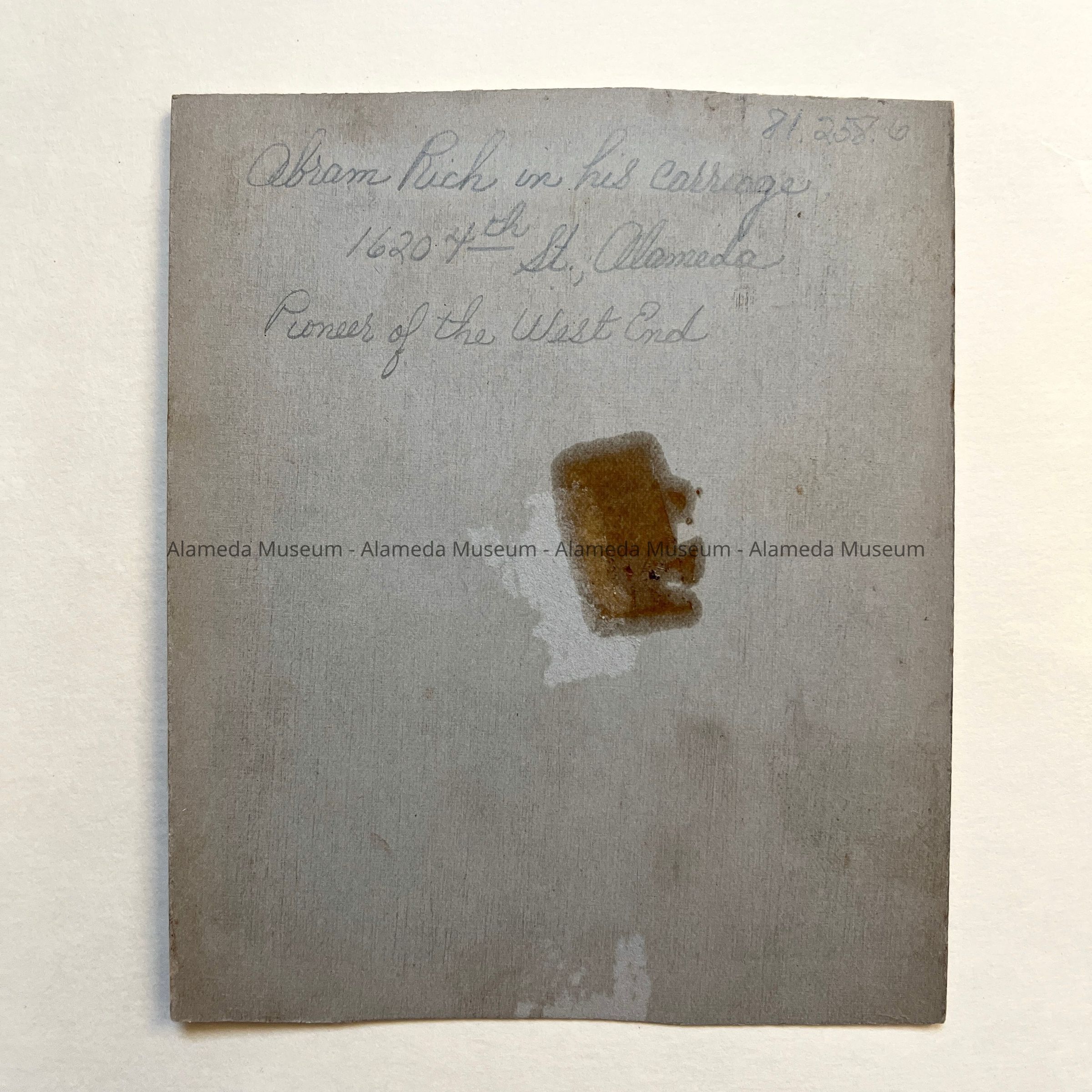History of Object: Photograph of Abram Rich in his carriage, 1620 4th Street, Alameda. Mr. Rich was a pioneer resident of the West End of Alameda, purchasing land in 1866 from W. W. Chipman.