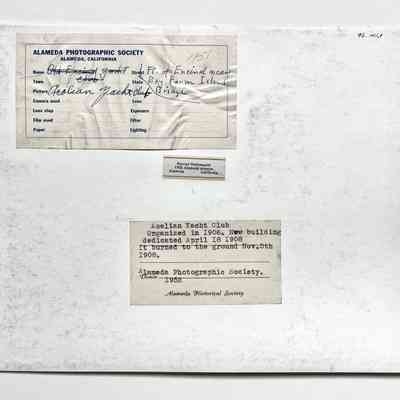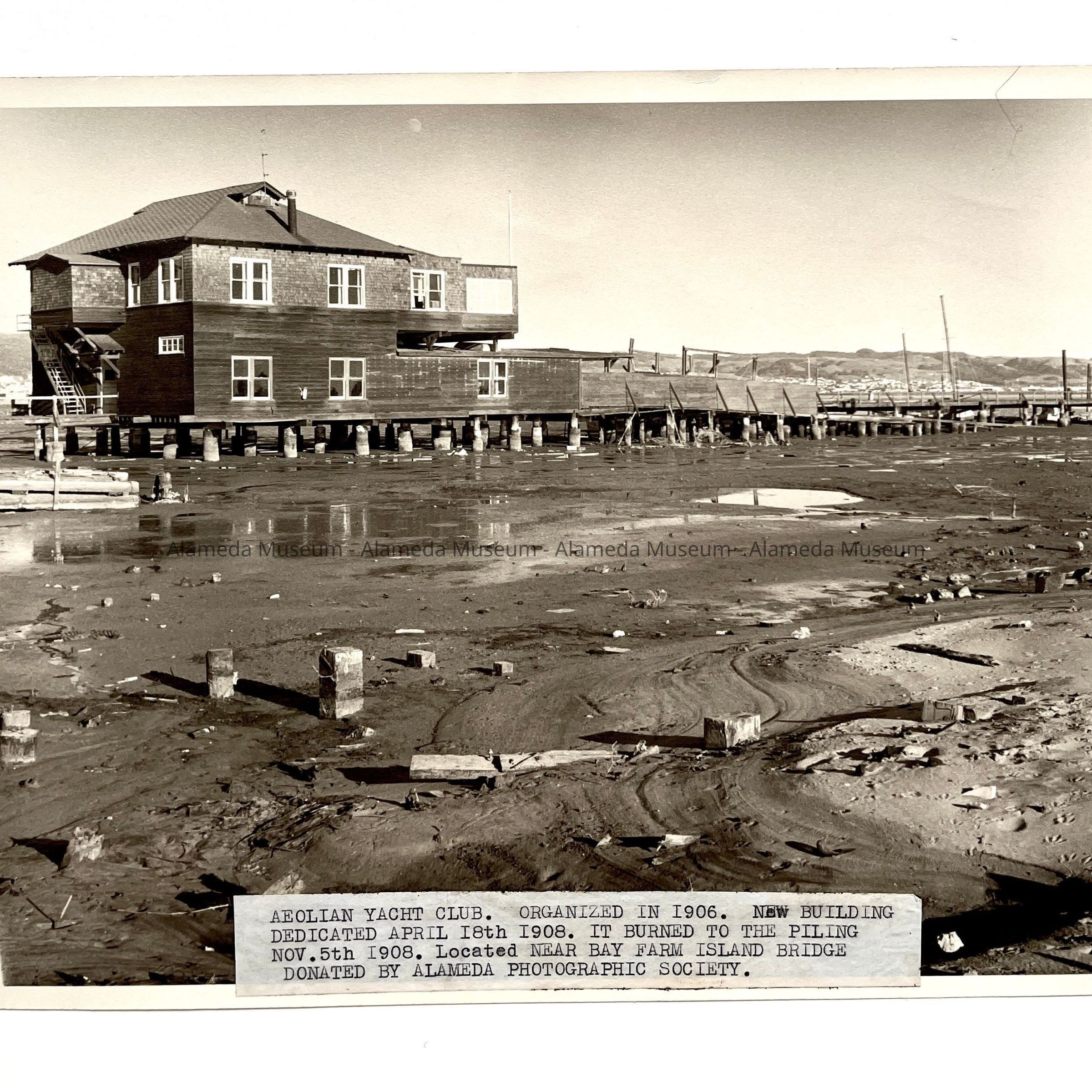 History of Object: View of the Aeolian Yacht Club's clubhouse, at low tide, near the foot of the Bay Farm Island Bridge. The Club was organized in 1906, and its clubhouse was destroyed by fire in 1908.