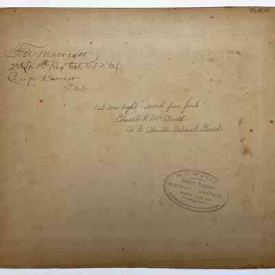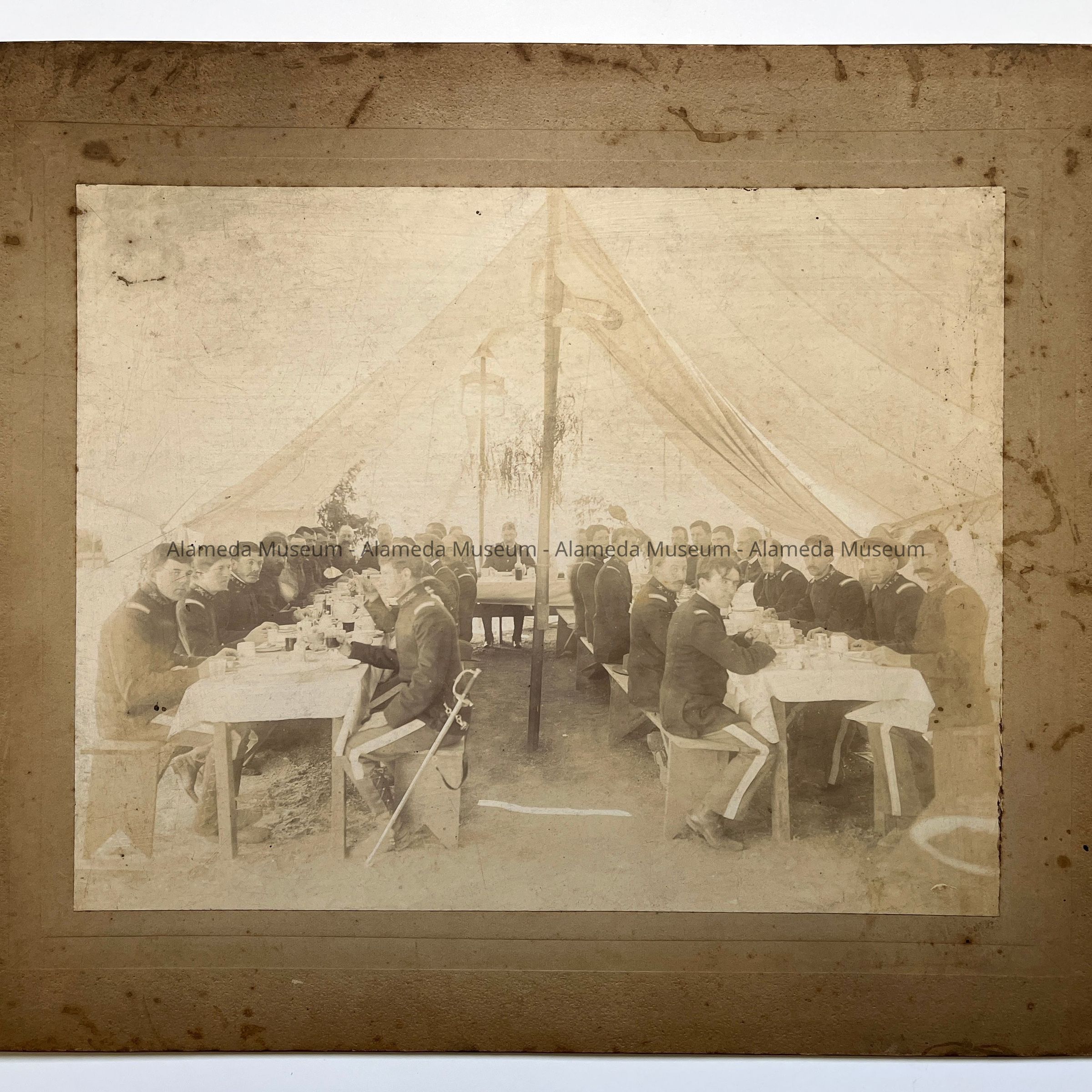 History of Object: Photo, afternoon meal, Co. G., Alameda National Guard, circa 1898. 1st row right, second from front, Edward R. McDonell, a member of the company, and a pioneer of Bay Farm Island, Alameda