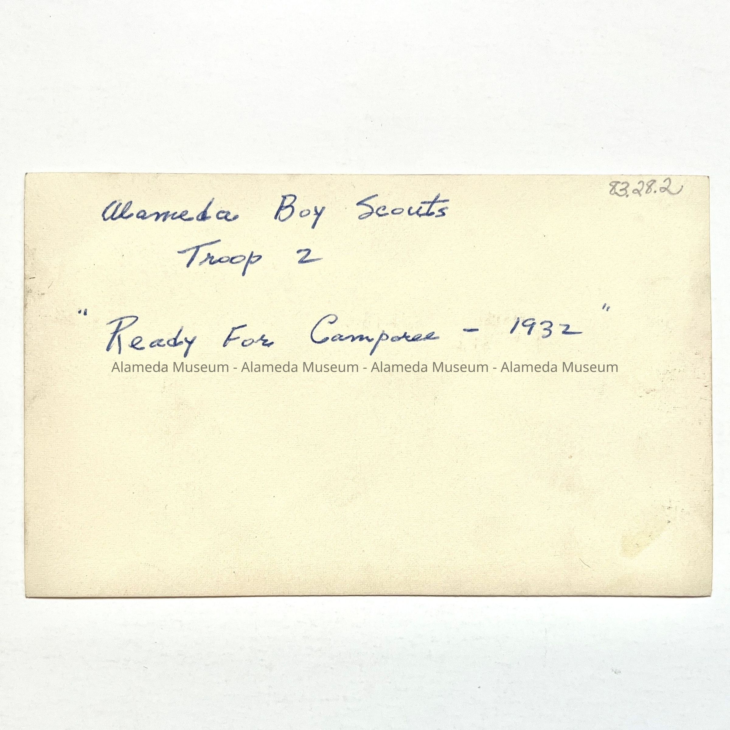 History of Object: Photo of the Alameda Boy Scouts, Troop 2, "Ready for Camporee-1932". Troop 2 was founded in Alameda in 1917.