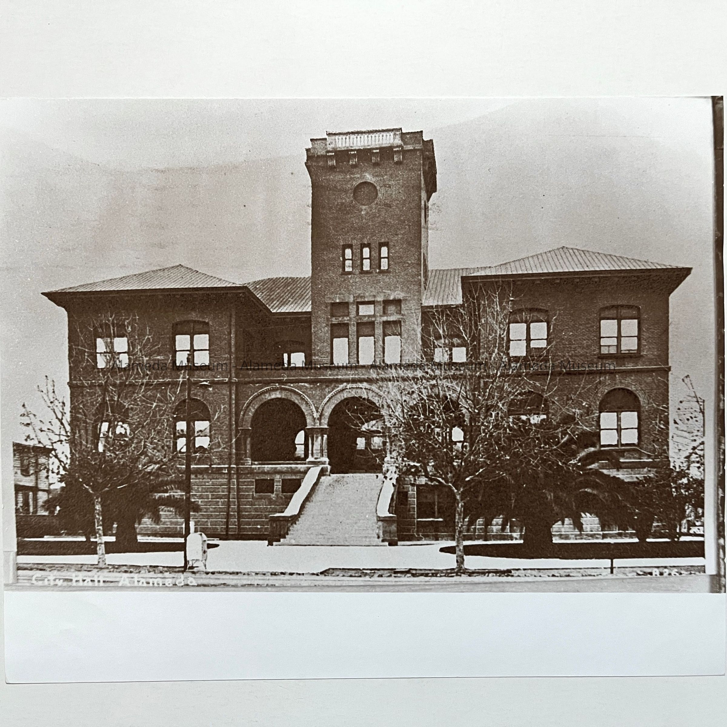 History of Object: View of Alameda City Hall showing the post-1906 Earthquake modified tower, but before the installation of Krusi tower clocks.