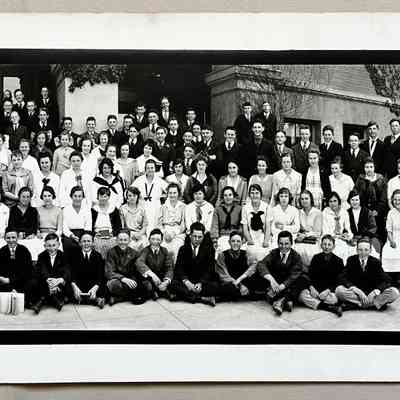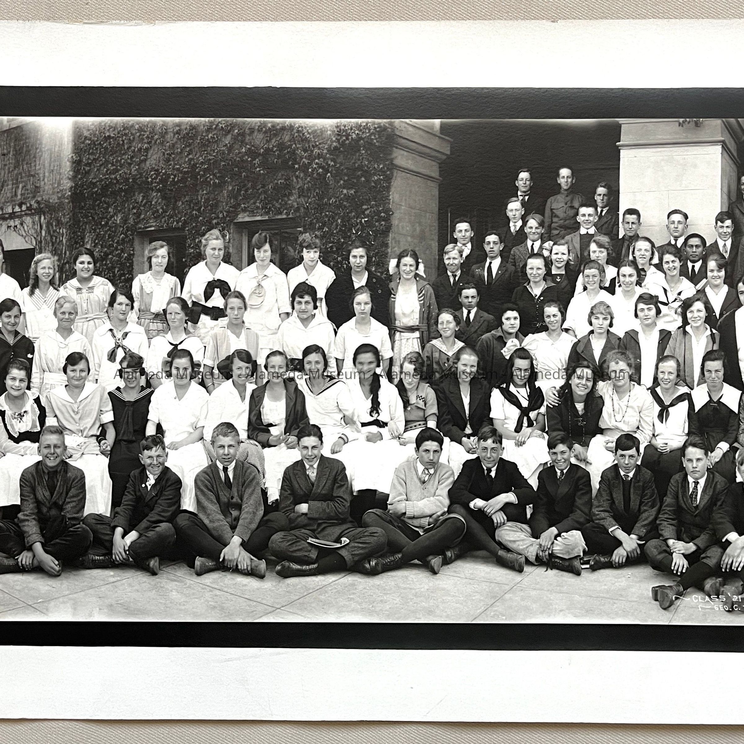 Photo Alameda High School Class of 1921 posed in front of the school, 1918Entry/Object ID