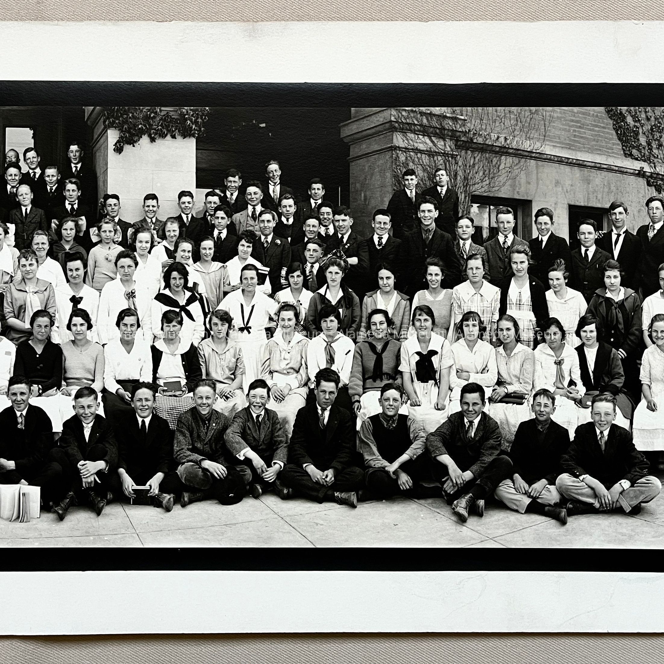 History of Object: Alameda High School - Class of 1921 - posed in front of the school for a class picture.