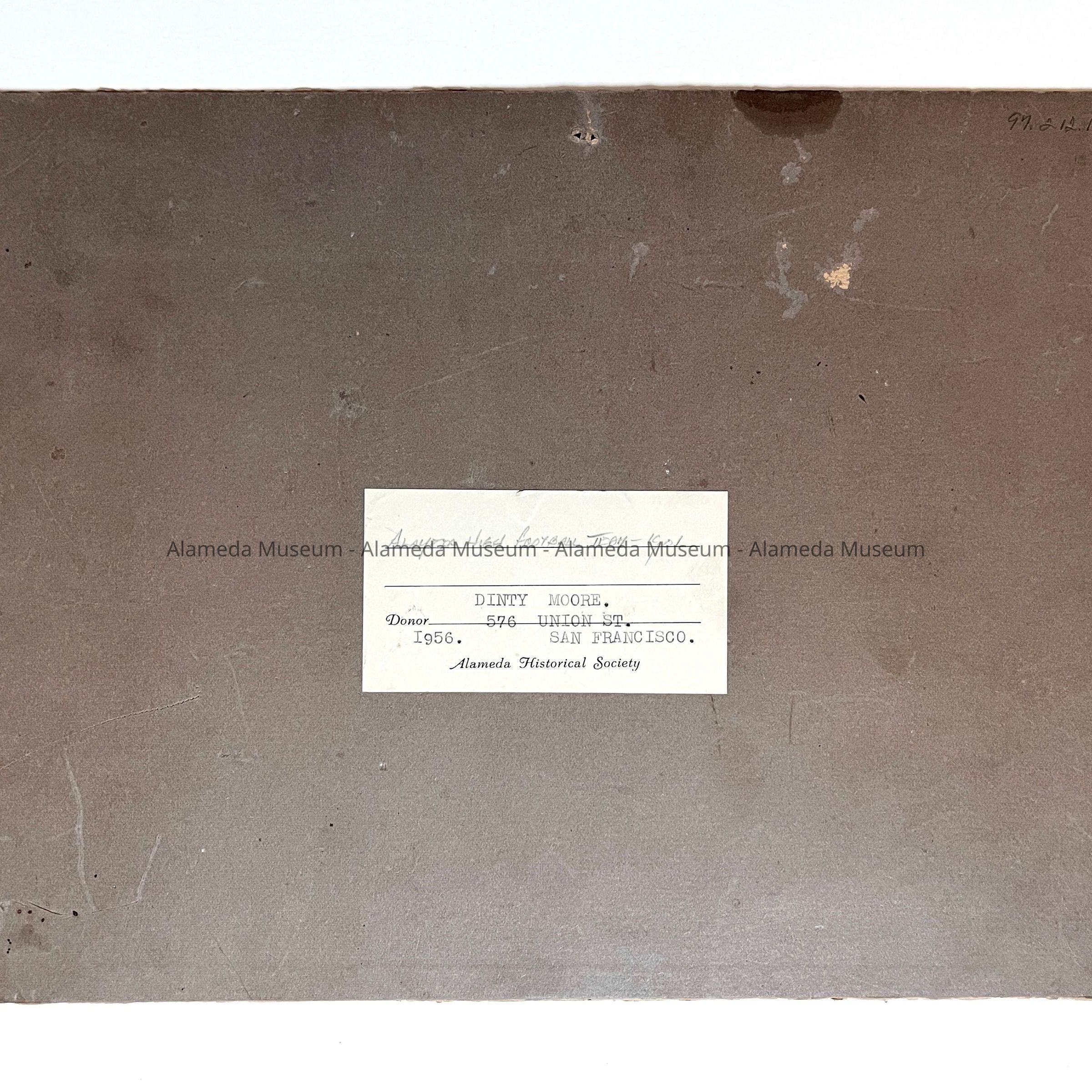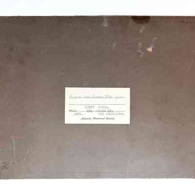 Description: Sepia-toned albumen print photo mounted on charcoal paperboard. Photographer unknown. The mounting has been damaged by spotting, cropping, nail holes, an old green cataloging label glued to the upper left corner, and an orange typed description label affixed to the bottom margin. The image, itself, has minor spotting and scratches.