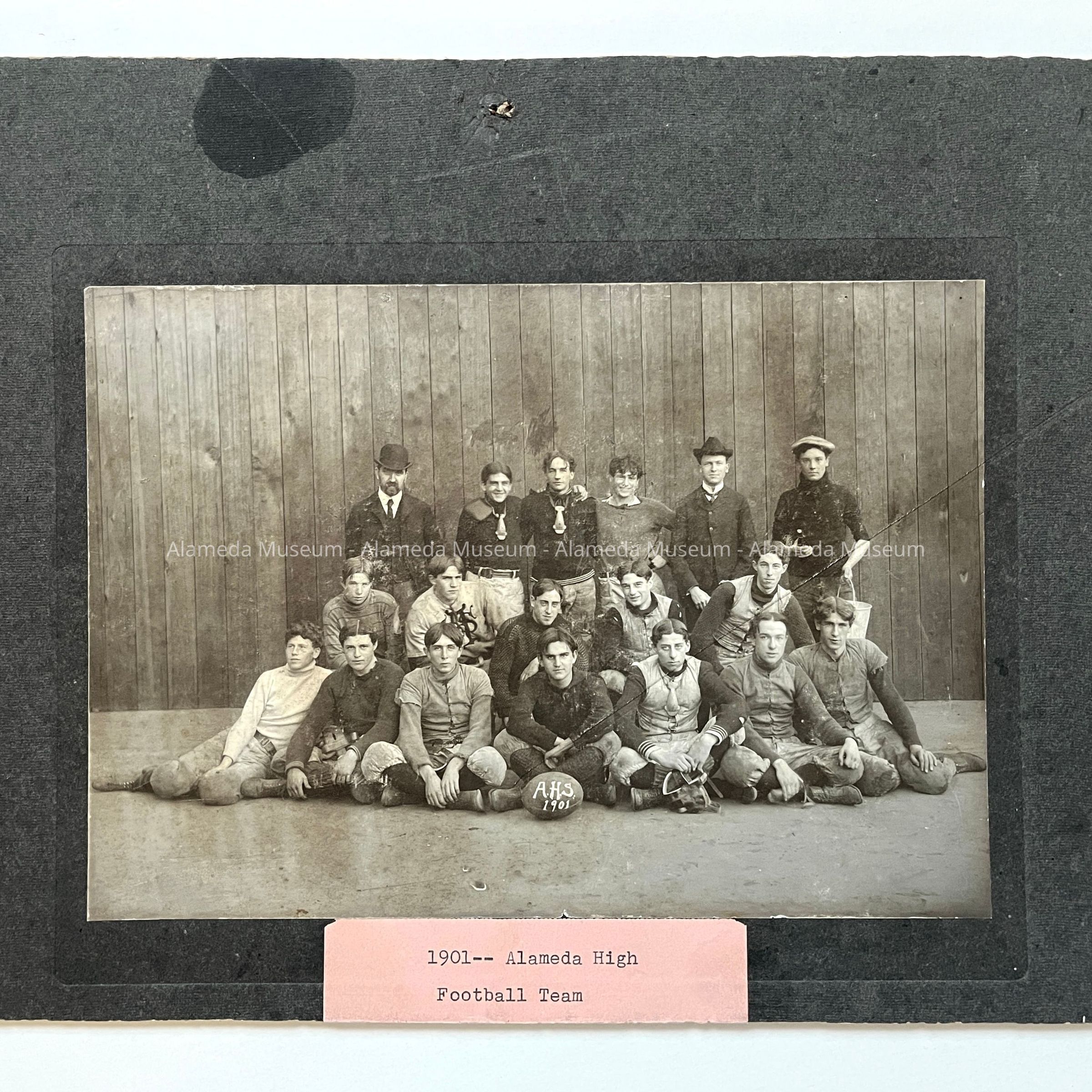 History of Object: A.H.S. football team, 1901, posed outdoors in front of a high wooden fence. Members are unidentified.