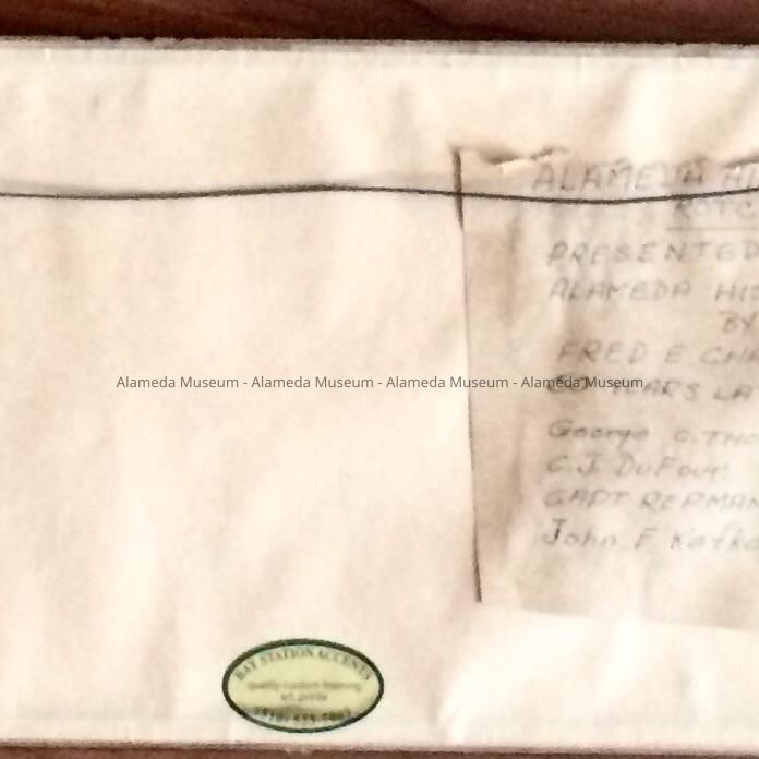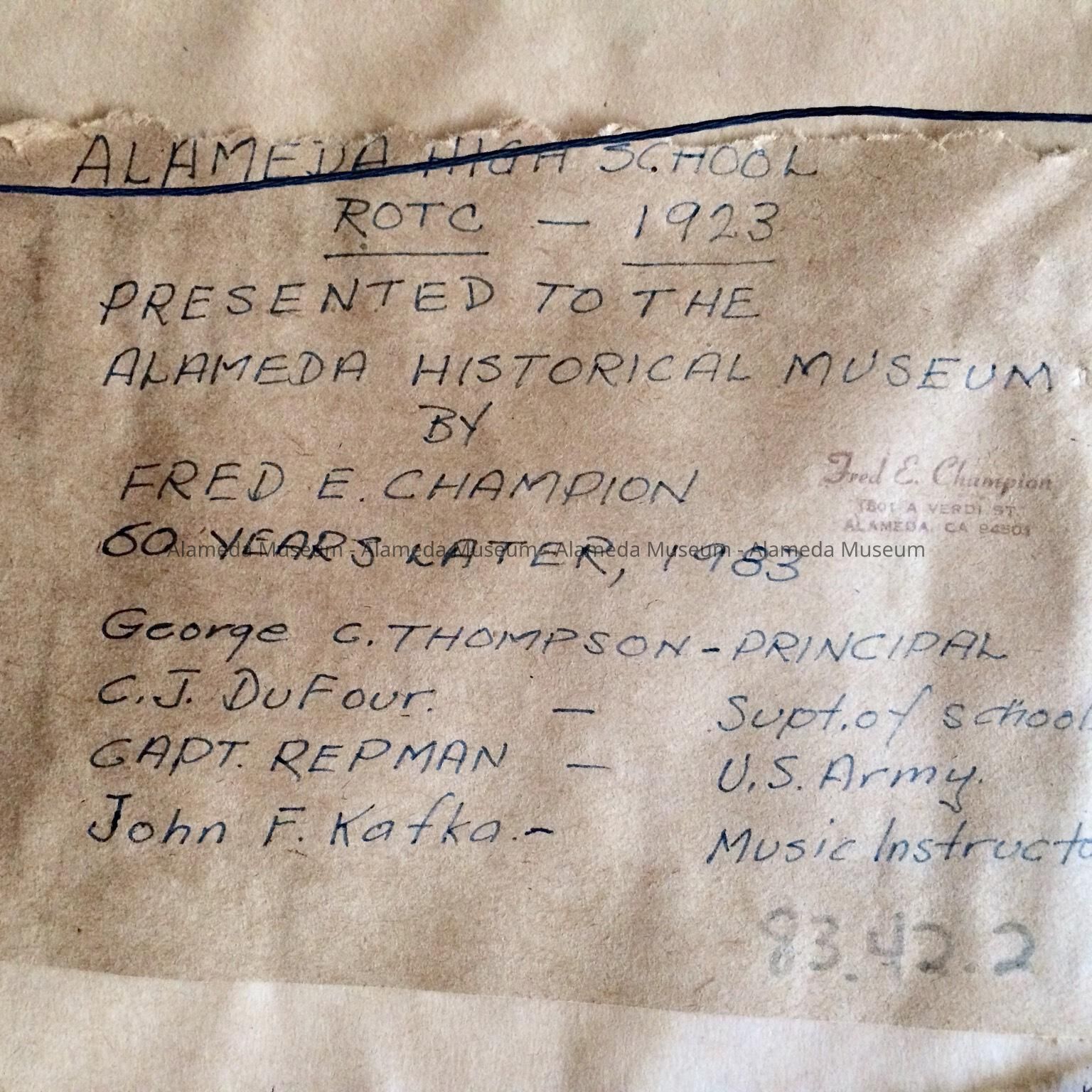 History of Object: Oblong photo depicting the entire unit of the Alameda High School R.O.T.C., 1923, posed on the grounds of Porter School. George C. Thompson, Principal, C. J. Dufour, Supt. of Schools, Capt. Repman, U. S. Army, and John F. Kafka, music instructor.