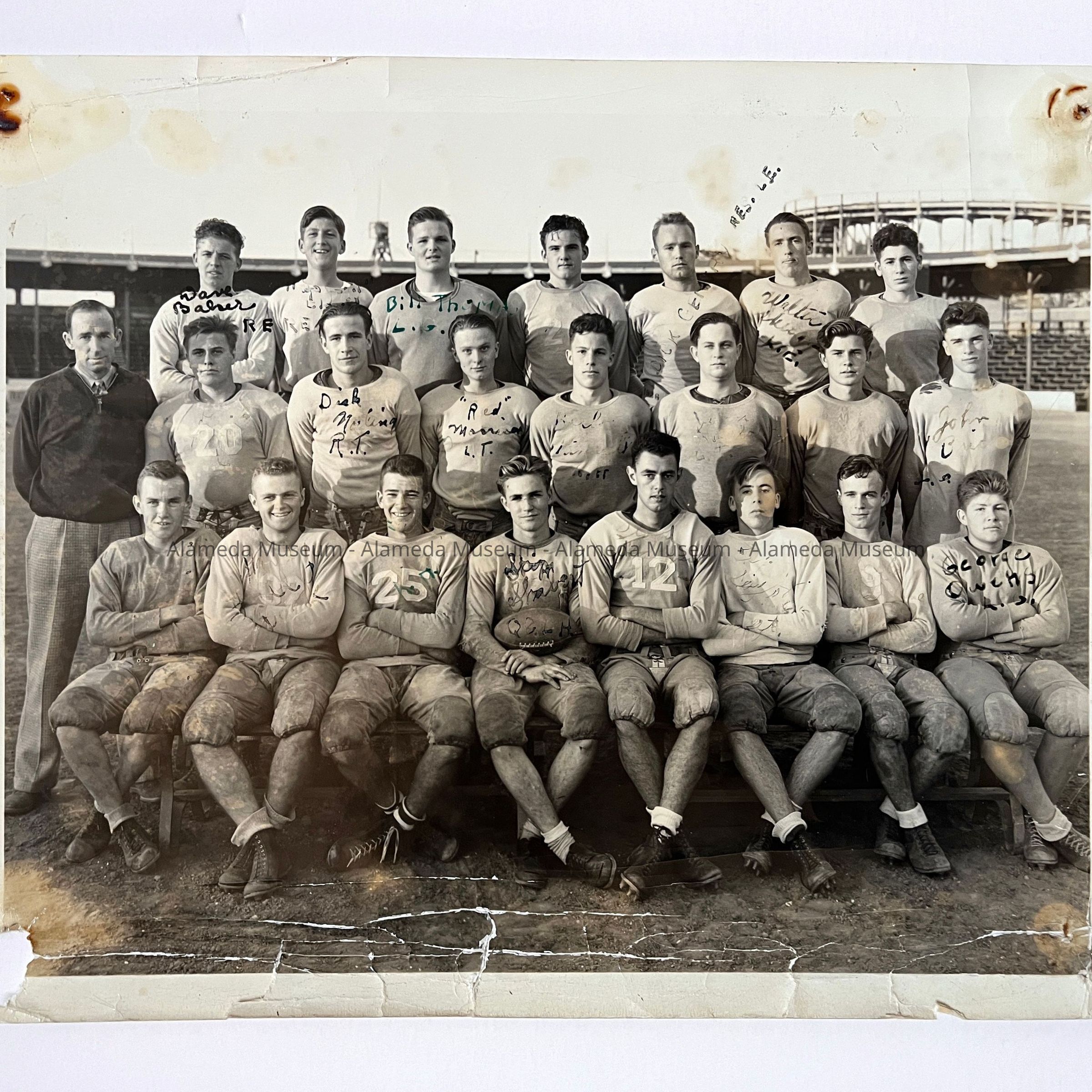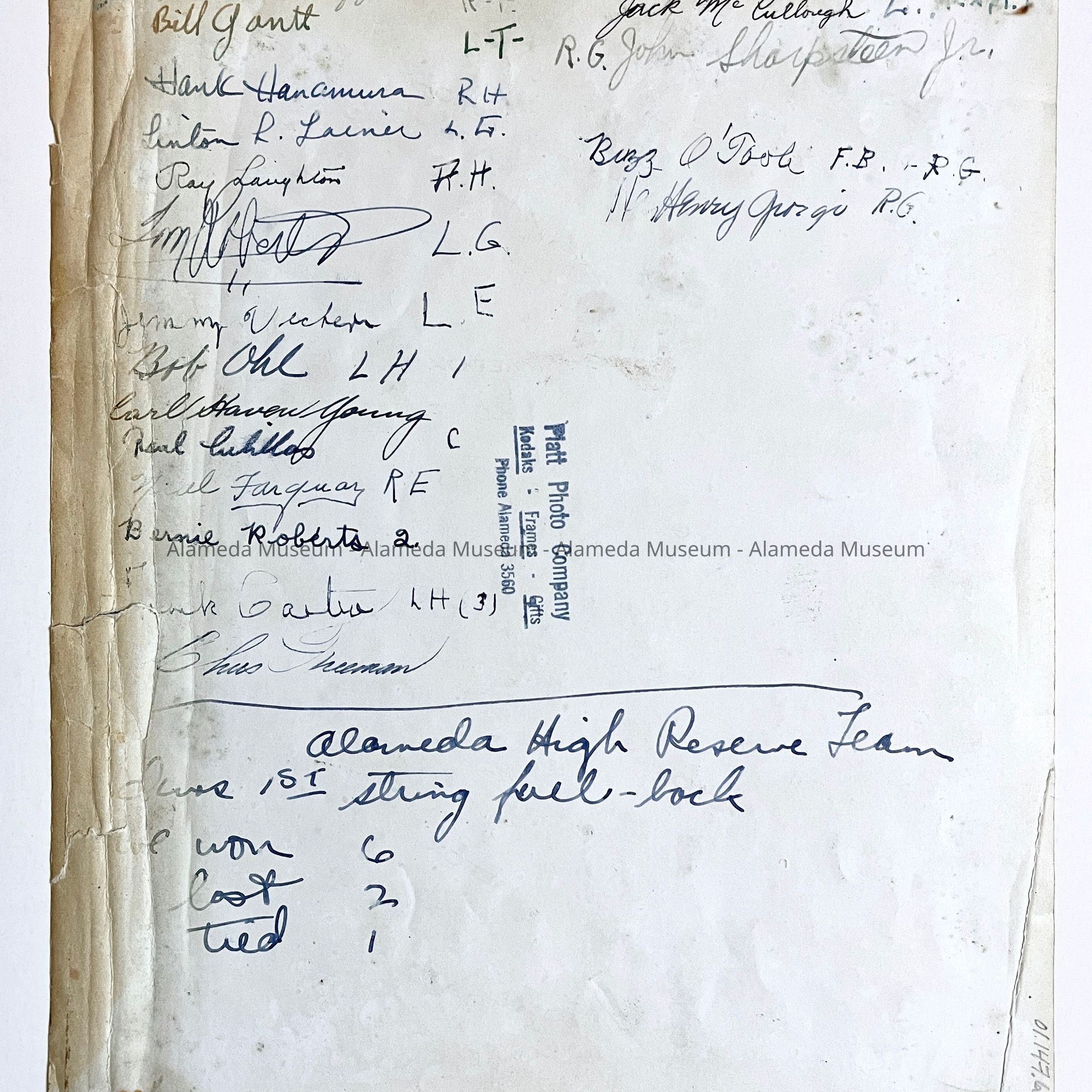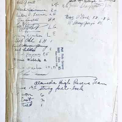 PHOTOGRAPH OF THE ALAMEDA HIGH SCHOOL RESERVE FOOTBALL TEAM. INCLUDED ON THE REVERSE SIDE OF THE PHOTO ARE AUTOGRAPHS OF ALL PARTICIPANTS. BACKGROUND APPEARS TO BE THE ROLLER COASTER AT NEPTUNE BEACH.