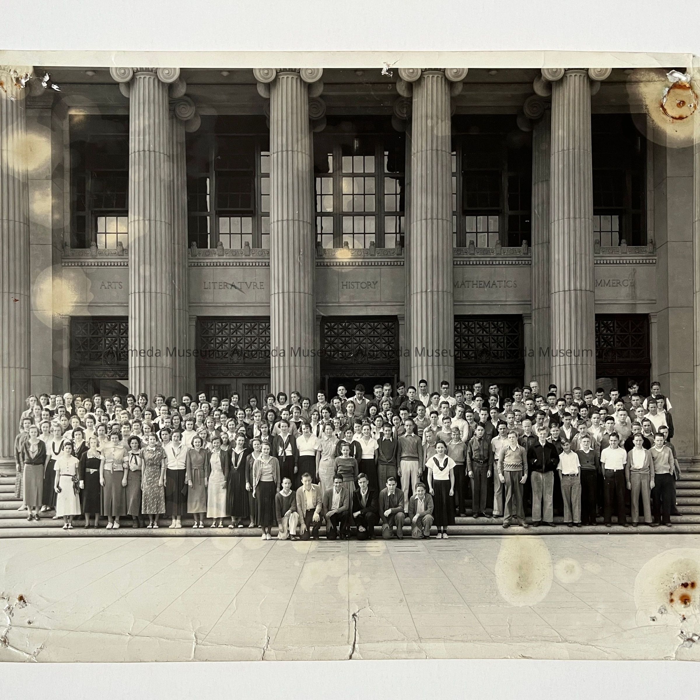 A PHOTOGRAPH OF THE SOPHOMORE CLASS OF ALAMEDA HIGH SCHOOL, STANDING IN FRONT OF THE MAIN ENTRANCE OF ALAMEDA HIGH SCHOOL.