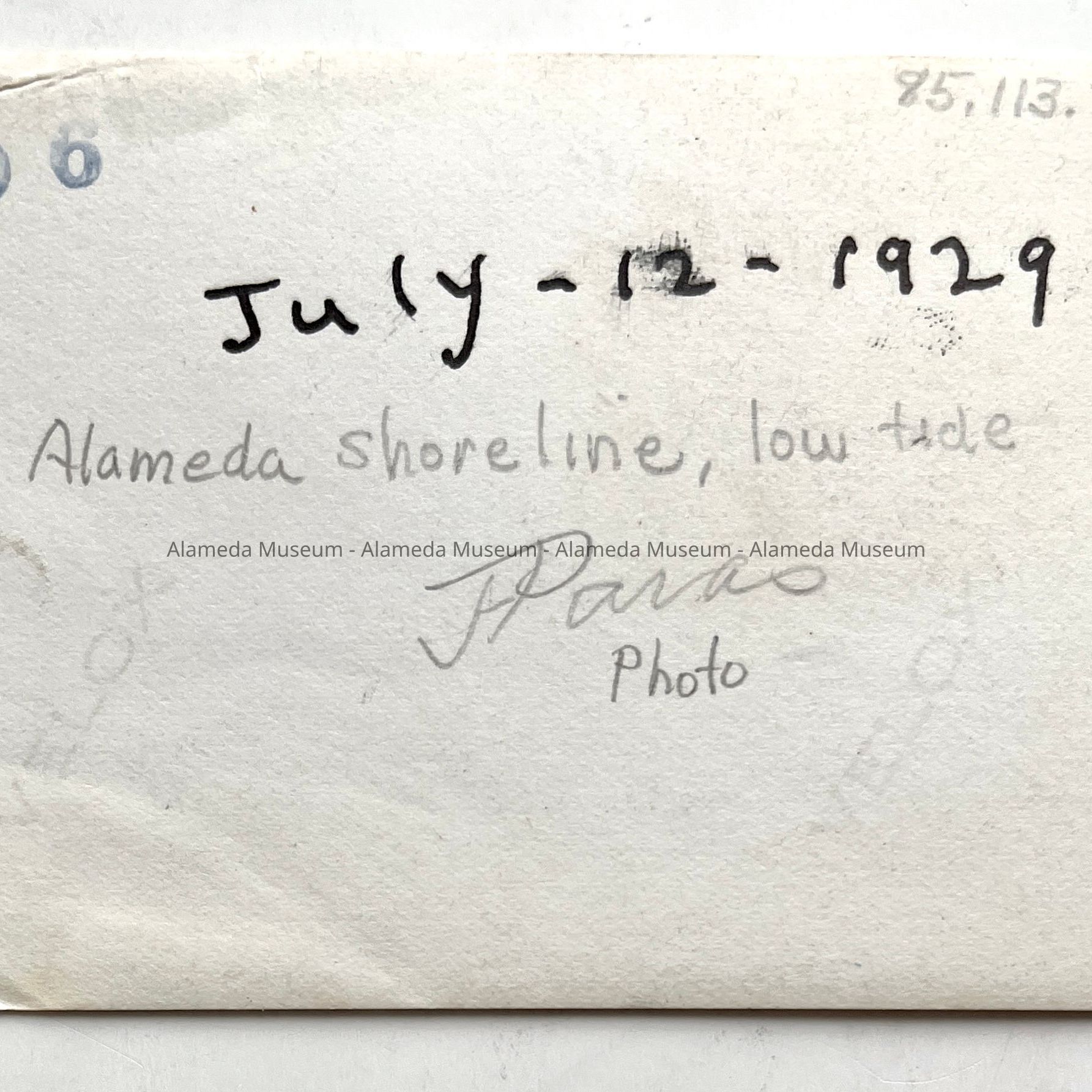 Photo taken of the Alameda shoreline (low tide), Alameda, dated July 12, 1929.