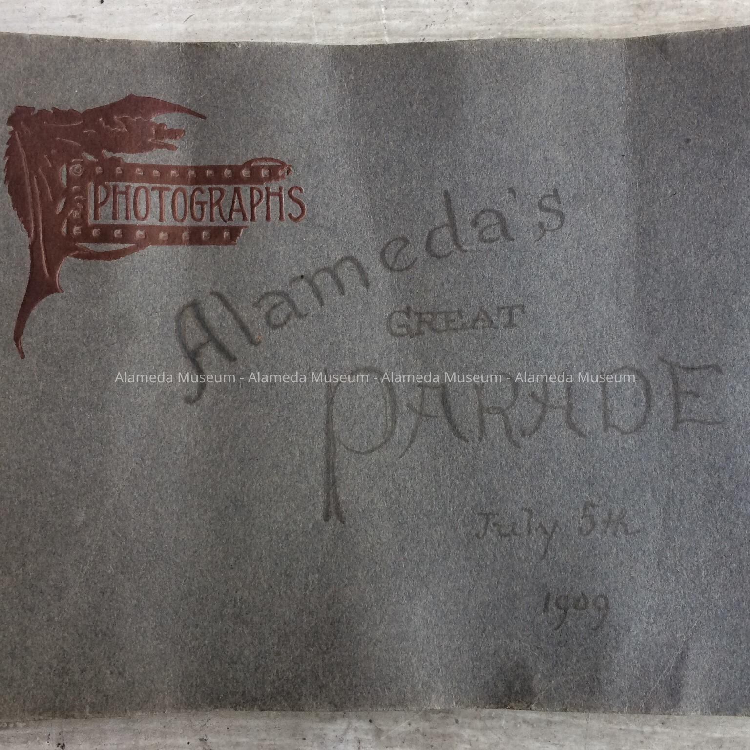Description: Grey colored soft cover photo album with inscription "Alameda's Great Parade, July 5th, 1909". The album contains sepia tinted photographs, one to each page.