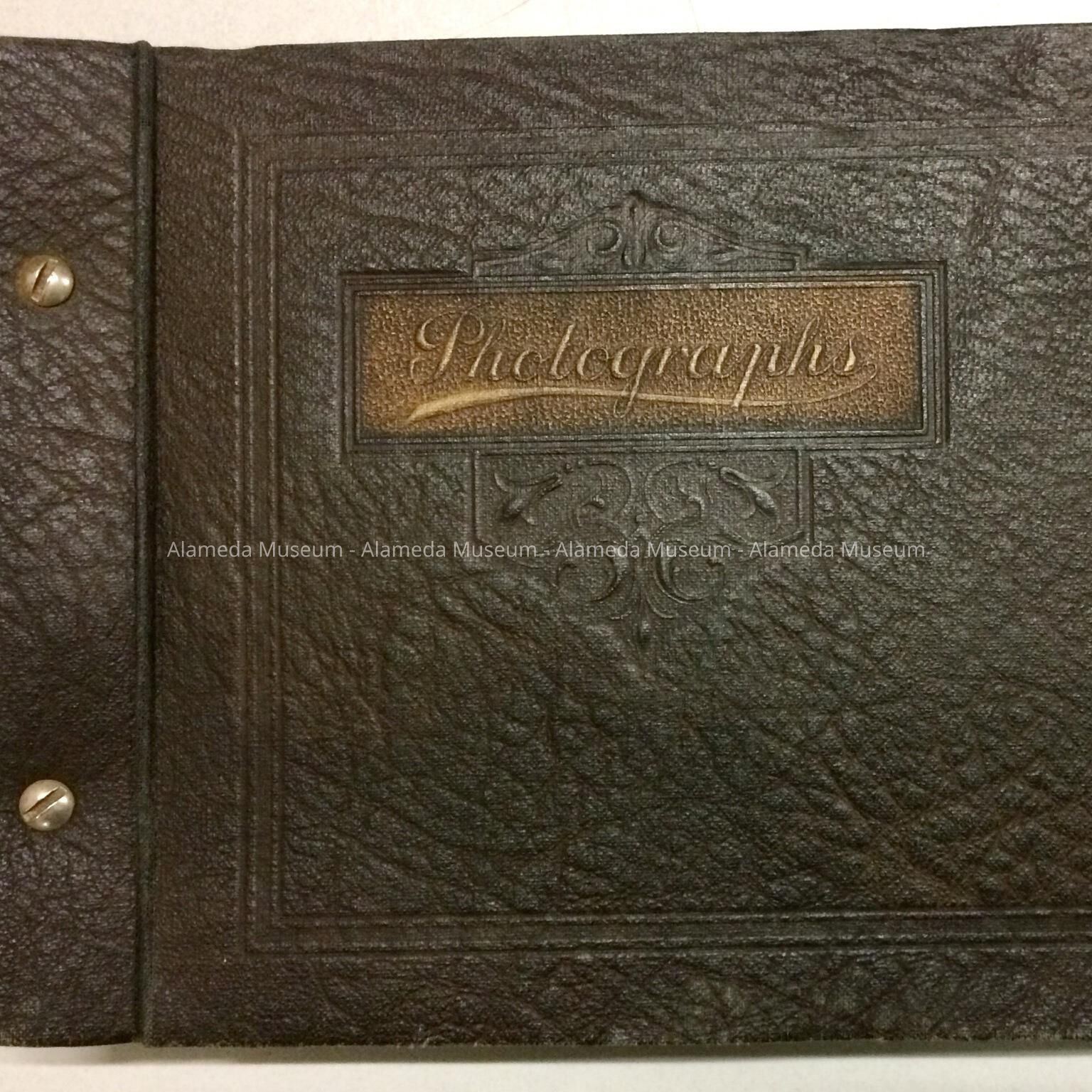 LOOSE-LEAF PHOTO ALBUM, WITH COVER OF IMITATION BROWN COLORED LEATHER. CAPTION ON COVER --- IN EMBOSSED LETTERING --- STATES, "PHOTOGRAPHS" IN GOLD. BINDING SECURED BY METAL SCREWS: INTERIOR PAGES OF BLACK-COLORED PAPER.