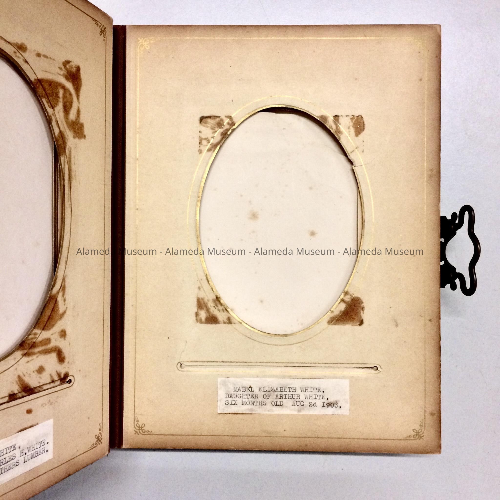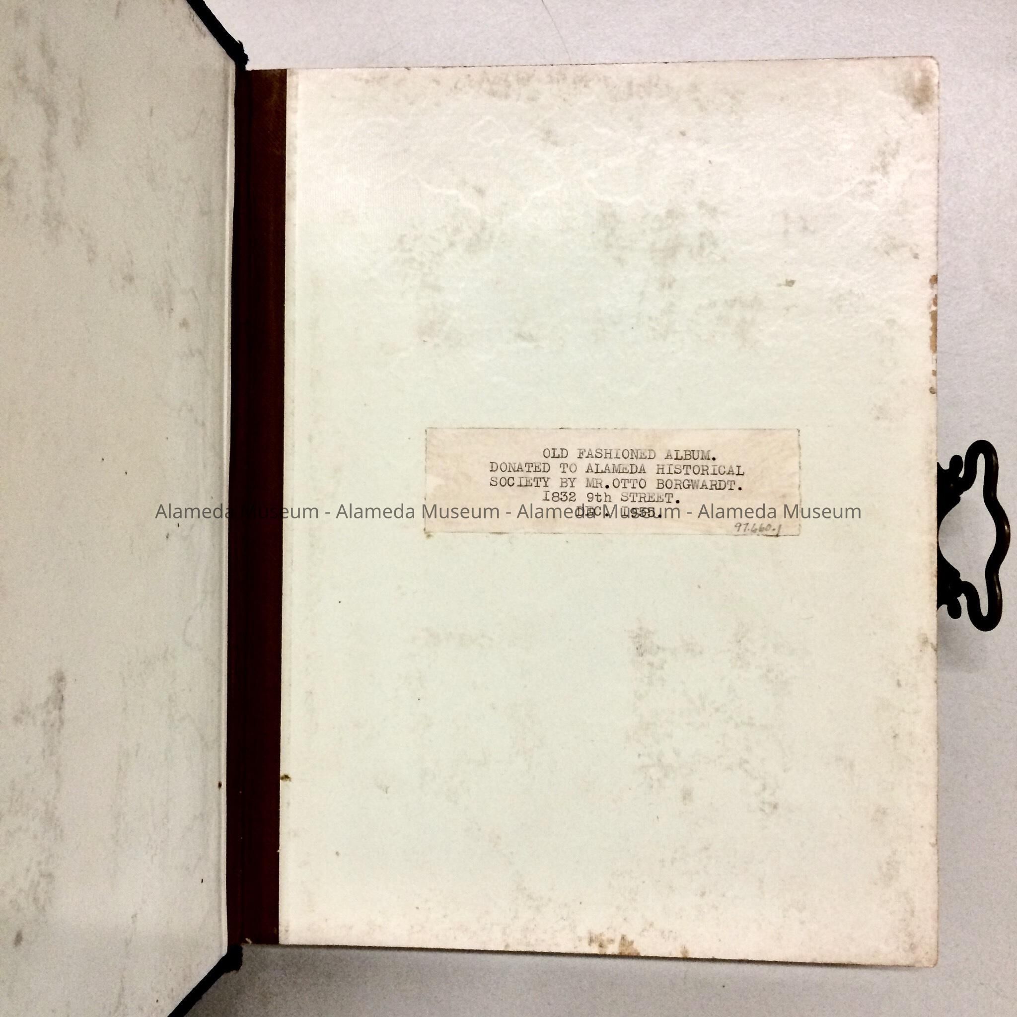 HISTORY OF OBJECT: ALBUM THAT BELONGED TO THE BORGWARDT FAMILY, RESIDENTS OF LINCOLN AVENUE, ALAMEDA. THE BORGWARDT FAMILY HAD A HOME BUILT AT 1527 LINCOLN AVENUE, IN 1892. ALBUM WAS DONATED IN DECEMBER, 1955, AND. IS PART OF THE ORIGINAL ALAMEDA HISTORICAL SOCIETY COLLECTION. ALBUM WAS NOT OFFICIALLY CATALOGED UNTIL 1997.