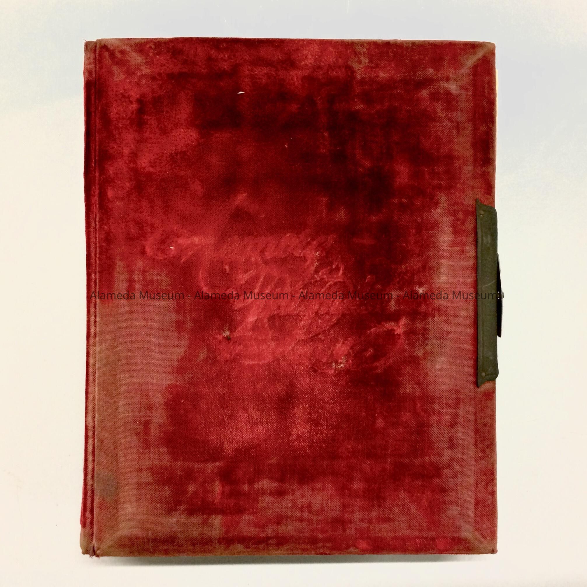 RED PLUSH, BOUND PHOTOGRAPH ALBUM. INDIVIDUAL PAGES HAVE DECORATIVE DESIGNS IN RED AND GOLD TYPE BORDERING PHOTOGRAPH SLOTS. COVER SECURED BY ADJUSTABLE NICKEL-PLATED CLASP.