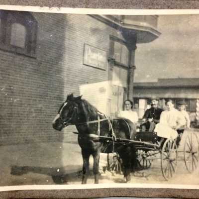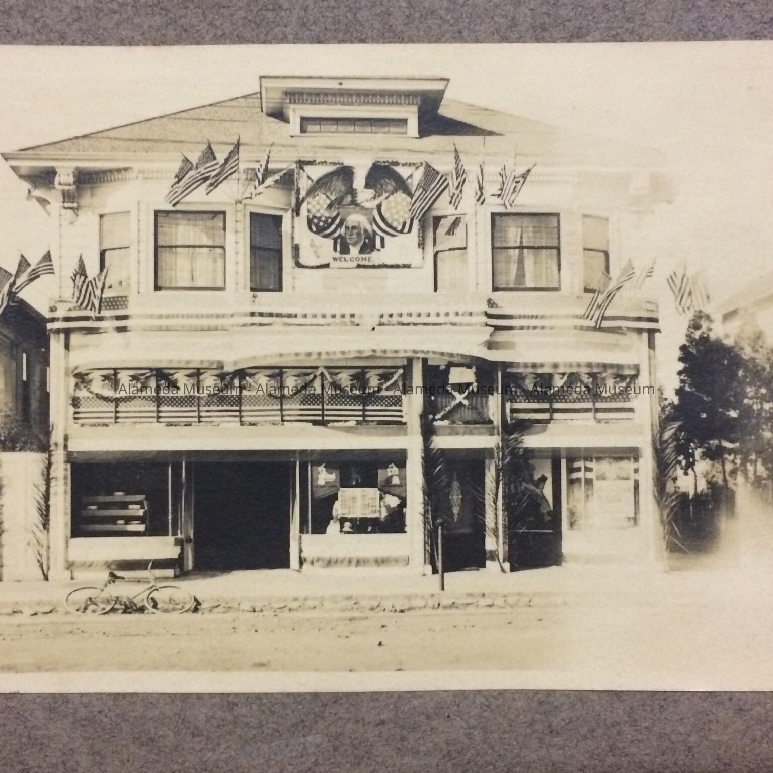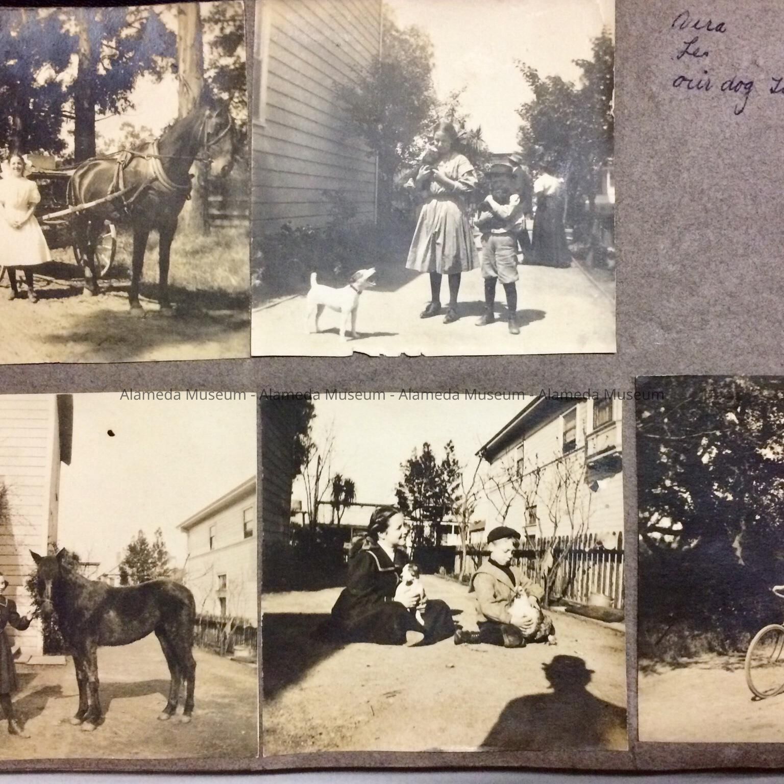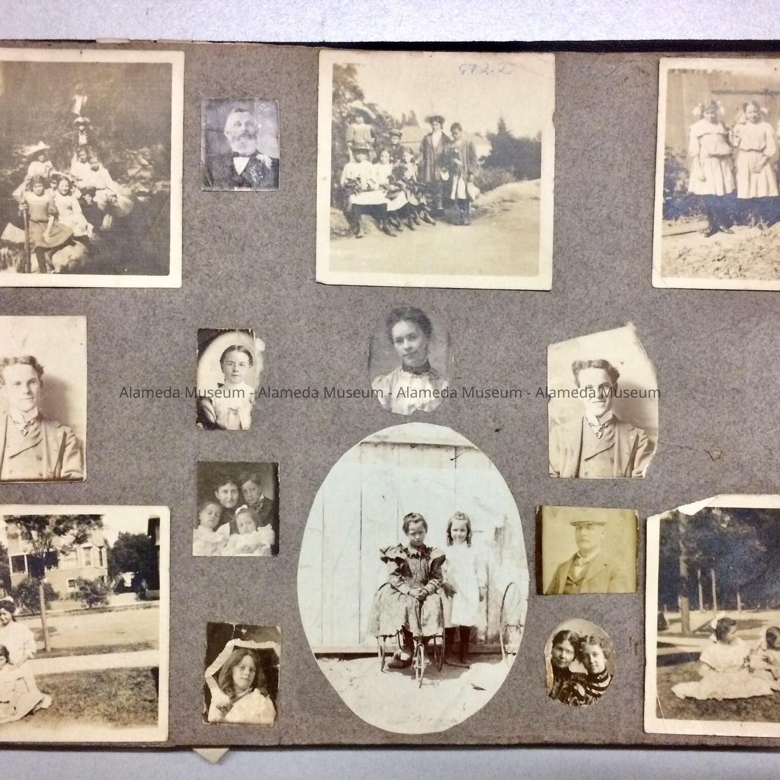 ALBUM CONTAINING PHOTOGRAPHS OF THE GEORGE T MORRIS FAMILY. MR MORRIS WAS AN OLD-TIME MERCHANT OF THE CITY OF ALAMEDA. HE OPERATED A GROCERY STORE AT 2048 LINCOLN AVENUE, WHICH HAS BEEN DEMOLISHED AND IS THE PRESENT SITE OF THE ALAMEDA BOYS' CLUB. MR MORRIS ORIGINALLY OPERATED A STORE IN THE FOSSING BUILDING AT PACIFIC AVENUE AND PARK STREET, ALAMEDA.