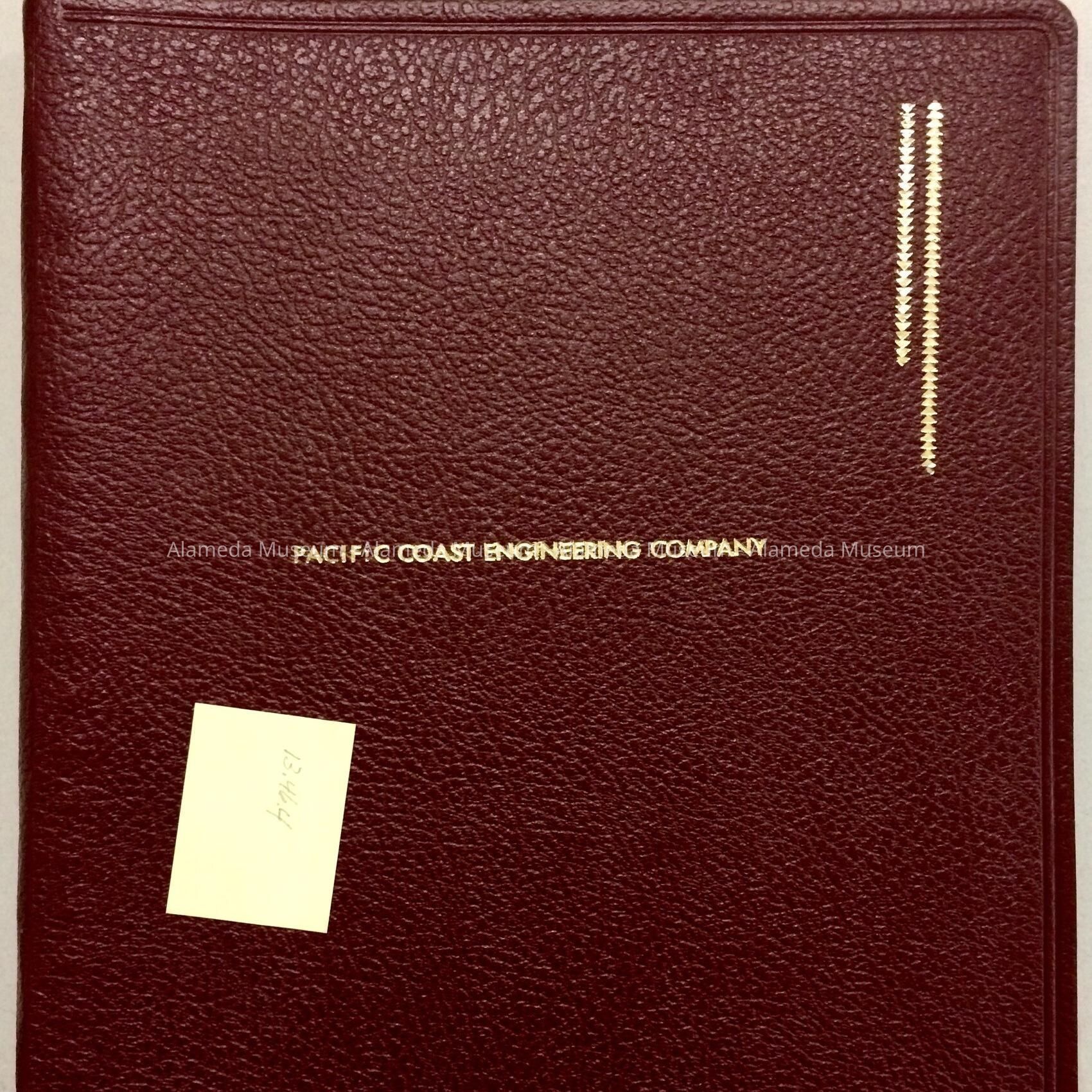 DESCRIPTION: A PHOTO ALBUM WITH METAL SPIRAL BINDING. COVER HAS AN INCISED CAPTION, "PACIFIC COAST ENGINEERING CO.," IN GOLD COLORED TYPE ON A WINE COLORED BACKGROUND.