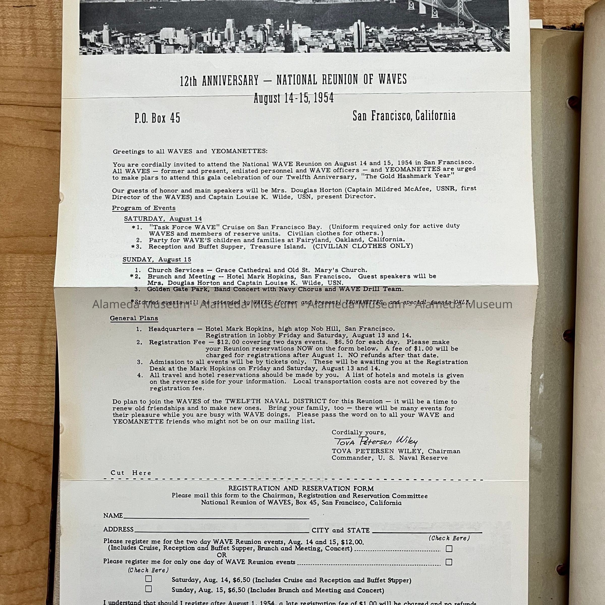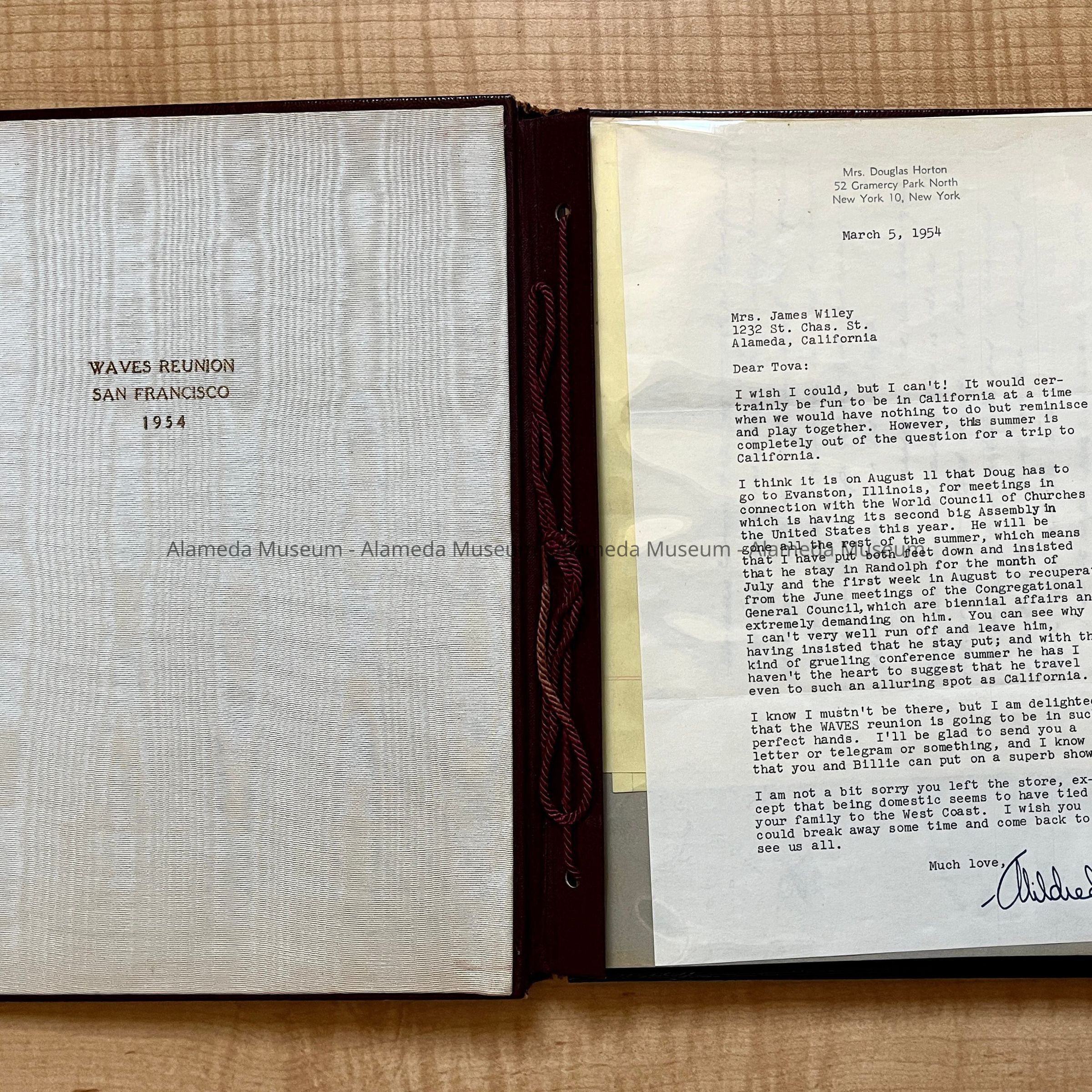 History of Object: AN ALBUM OF THE TWELFTH ANNIVERSARY NATIONAL REUNION OF WAVES, HELD ON AUGUST 14 AND 15, 1954 IN SAN FRANCISCO, CALIFORNIA. THE ALBUM CONTAINS BLACK-AND-WHITE PHOTOS OF THE EVENT AS WELL AS PHOTOS OF VARIOUS MEMBERS AND OFFICERS OF THE WAVES. INSIDE OF THE ALBUM IS A PERSONAL LETTER ADDRESS TO MRS. JAMES WILEY (TOVA), 1232 SAINT CHARLES STREET, ALAMEDA.