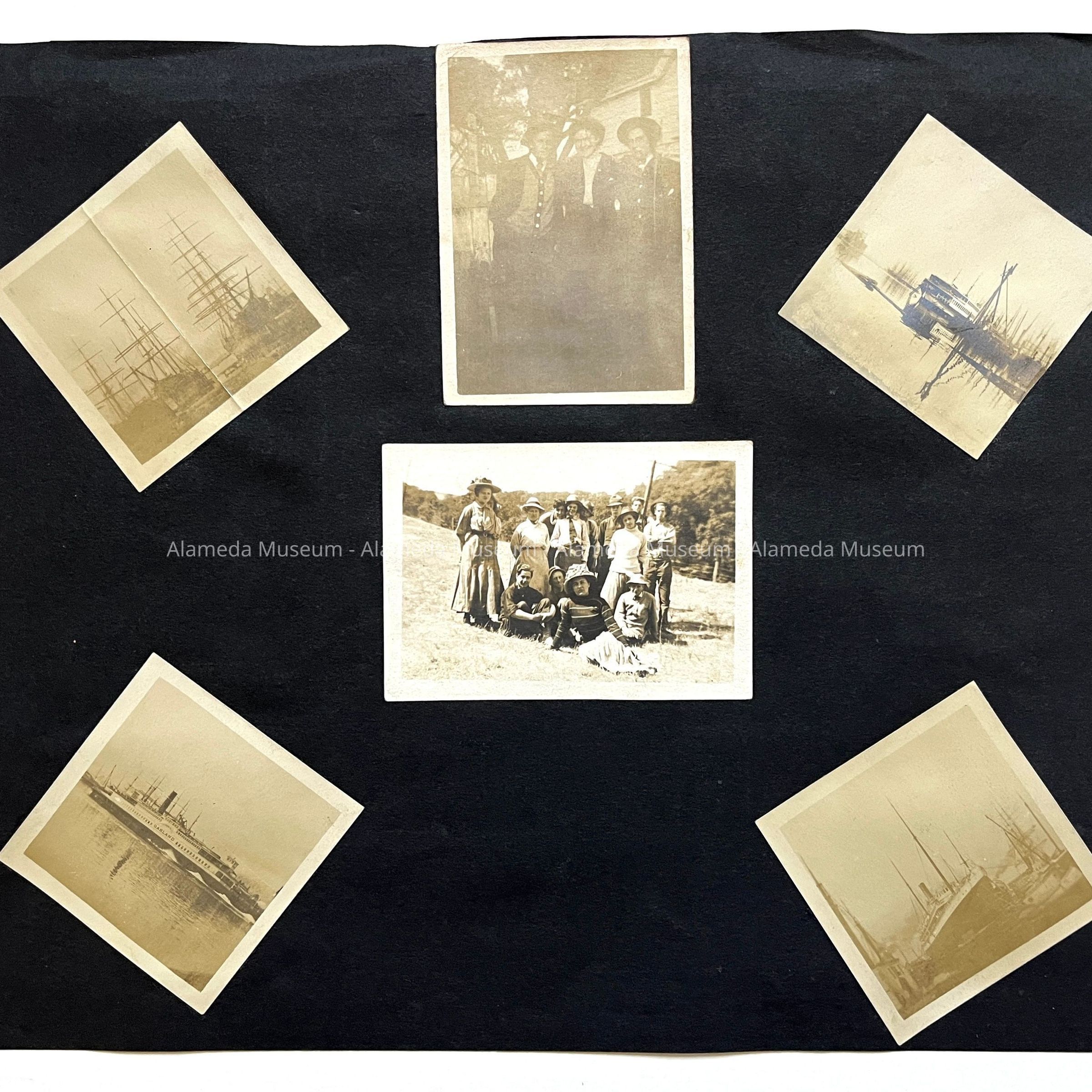 PHOTOGRAPH ALBUM PAGE CONTAINING PHOTOGRAPHS OF THE FERRY BOAT, "OAKLAND," AND WHAT APPEARS TO BE ALASKA PACKERS' SAILING SHIPS AND POSSIBLY THE ORIGINAL HIGH STREET BRIDGE, ALAMEDA, CA,