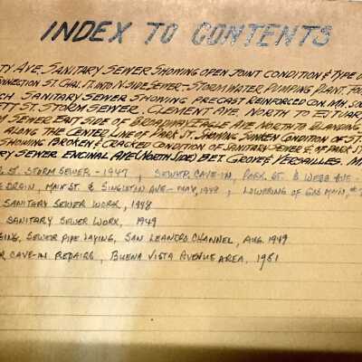 History of Object: Municipally prepared album entitled: "Photographic Reports Covering Sewer Construction & Repairs", and it illustrates a number of projects occurring during the period 1944 to 1951. There are some 168 photographs, and their chief interest lies in their background scenes showing landmarks and buildings no longer extant.