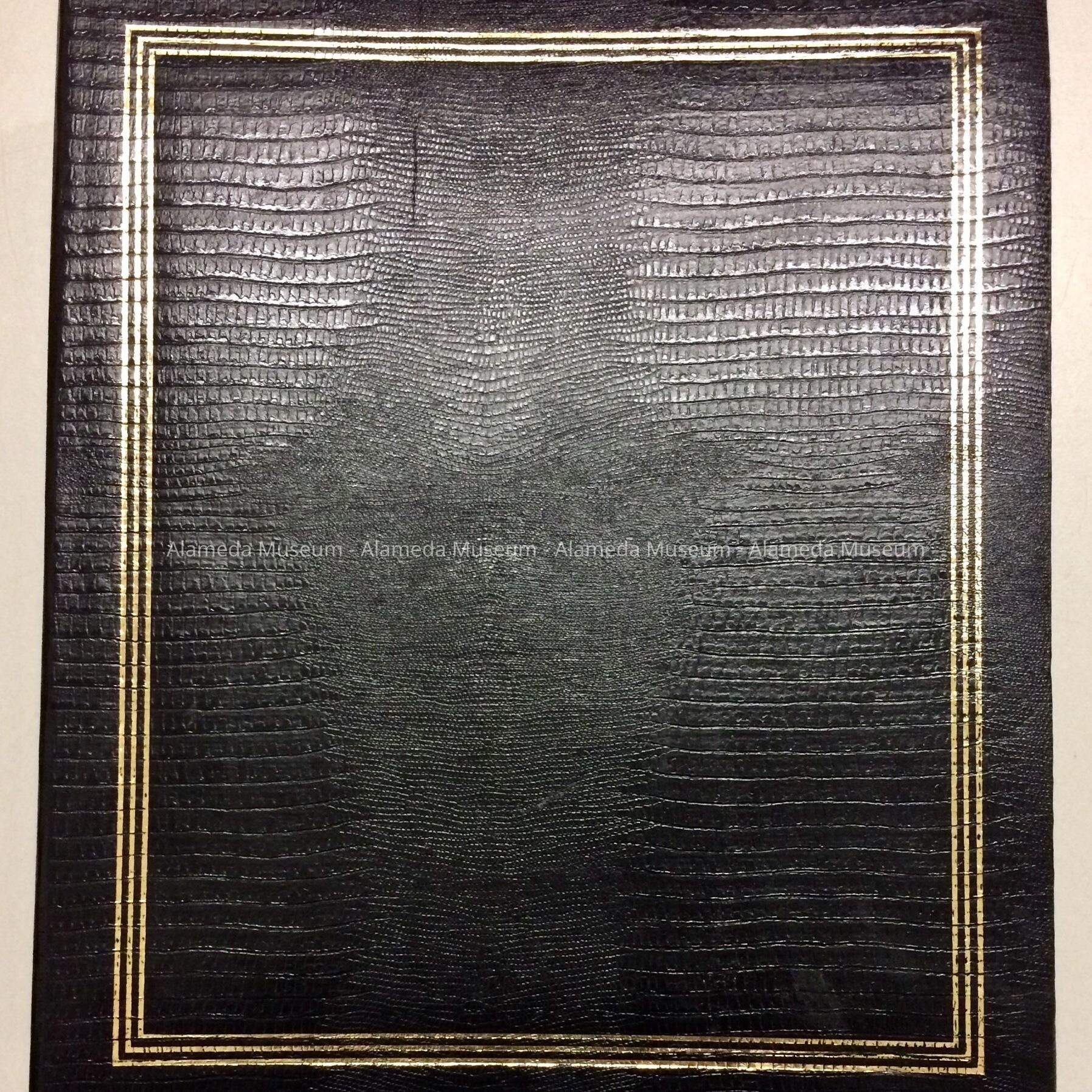 A HARD-BOUND BINDER-STYLE PHOTO ALBUM, WITH COVER OF IMITATION BLACK LEATHER TRIMMED IN GOLD.