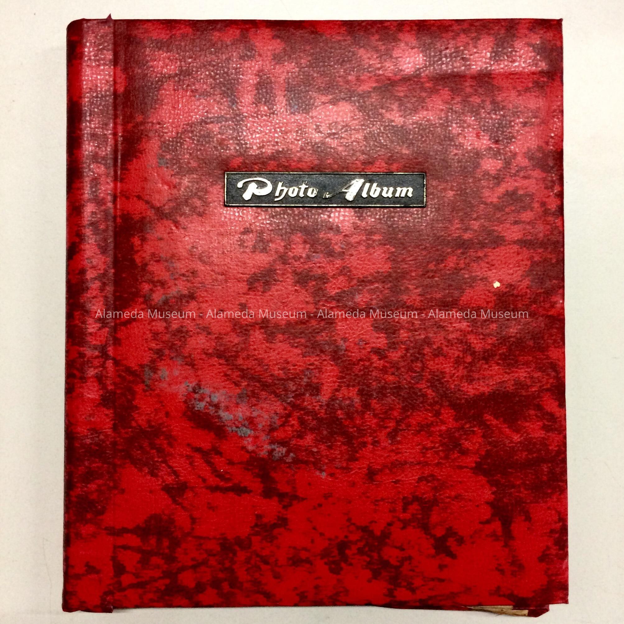 Description: Loose leaf photo album with red colored plastic cover. Cover had embossed caption "Photo Album” in gold and black.