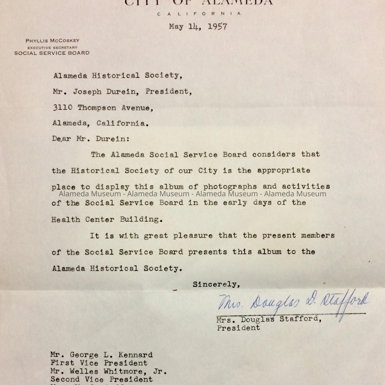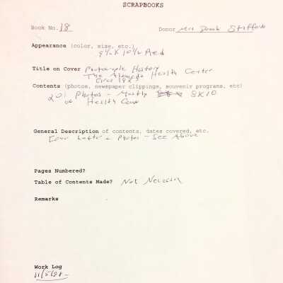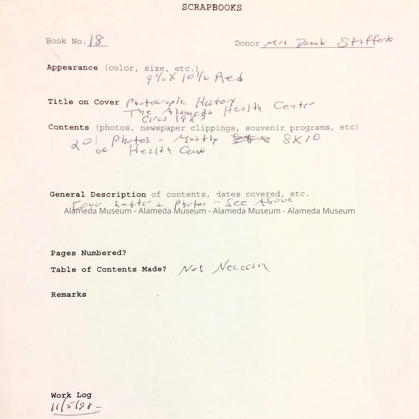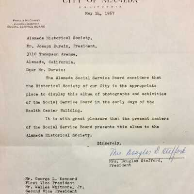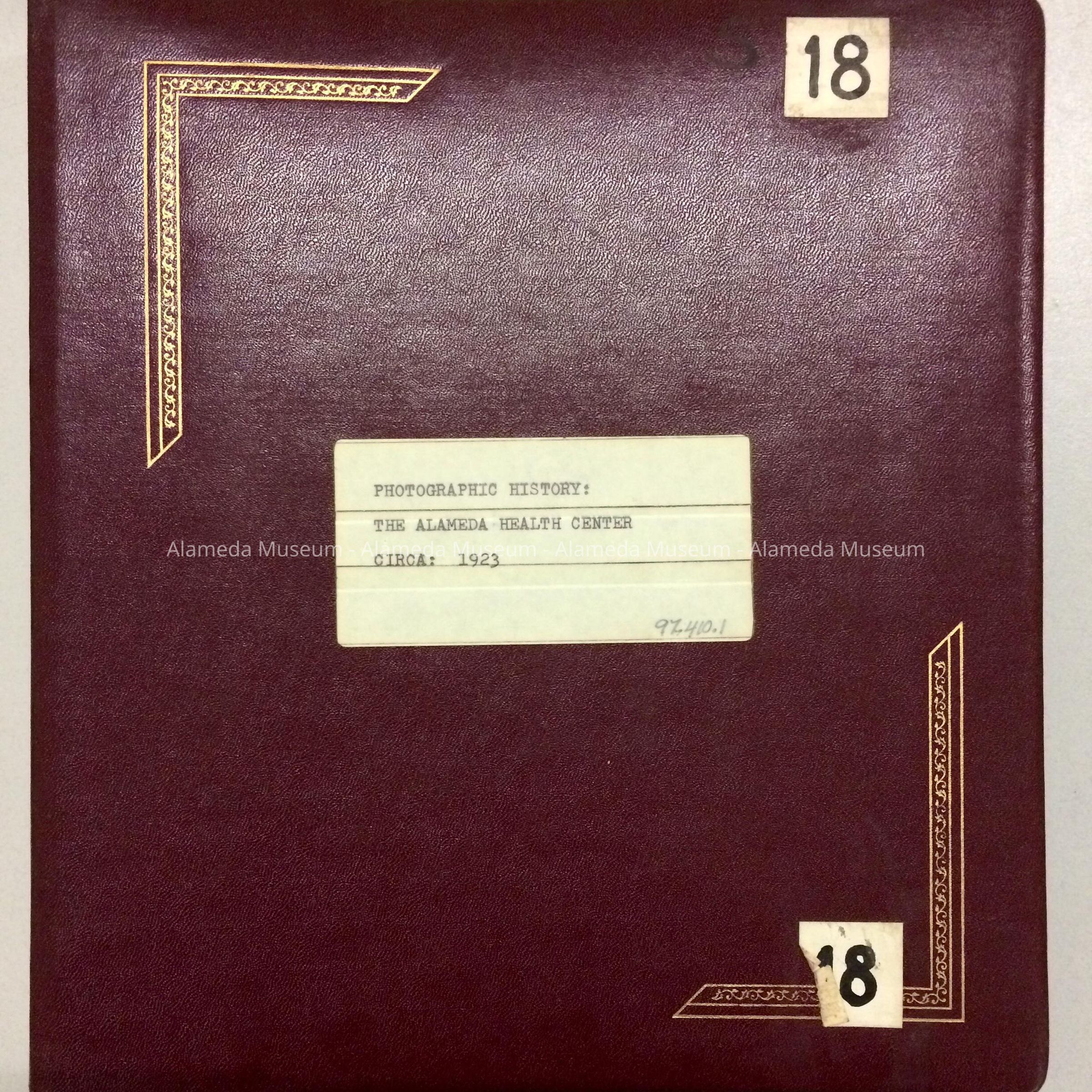 ALBUM CONTAINING PHOTOGRAPHS OF THE HEALTH CENTER BUILDING, INCLUDING EXTERIOR AND INTERIOR SHOTS. ALSO INCLUDED IS A LETTER, DATED MAY 14, 1957, TO THE THEN PRESIDENT OF THE ALAMEDA HISTORICAL SOCIETY --- JOSEPH DUREIN --- CONCERNING DONATION OF THE ALBUM. ALBUM WAS NUMBERED, "18," AND NOT CATALOGED UNTIL 1997.