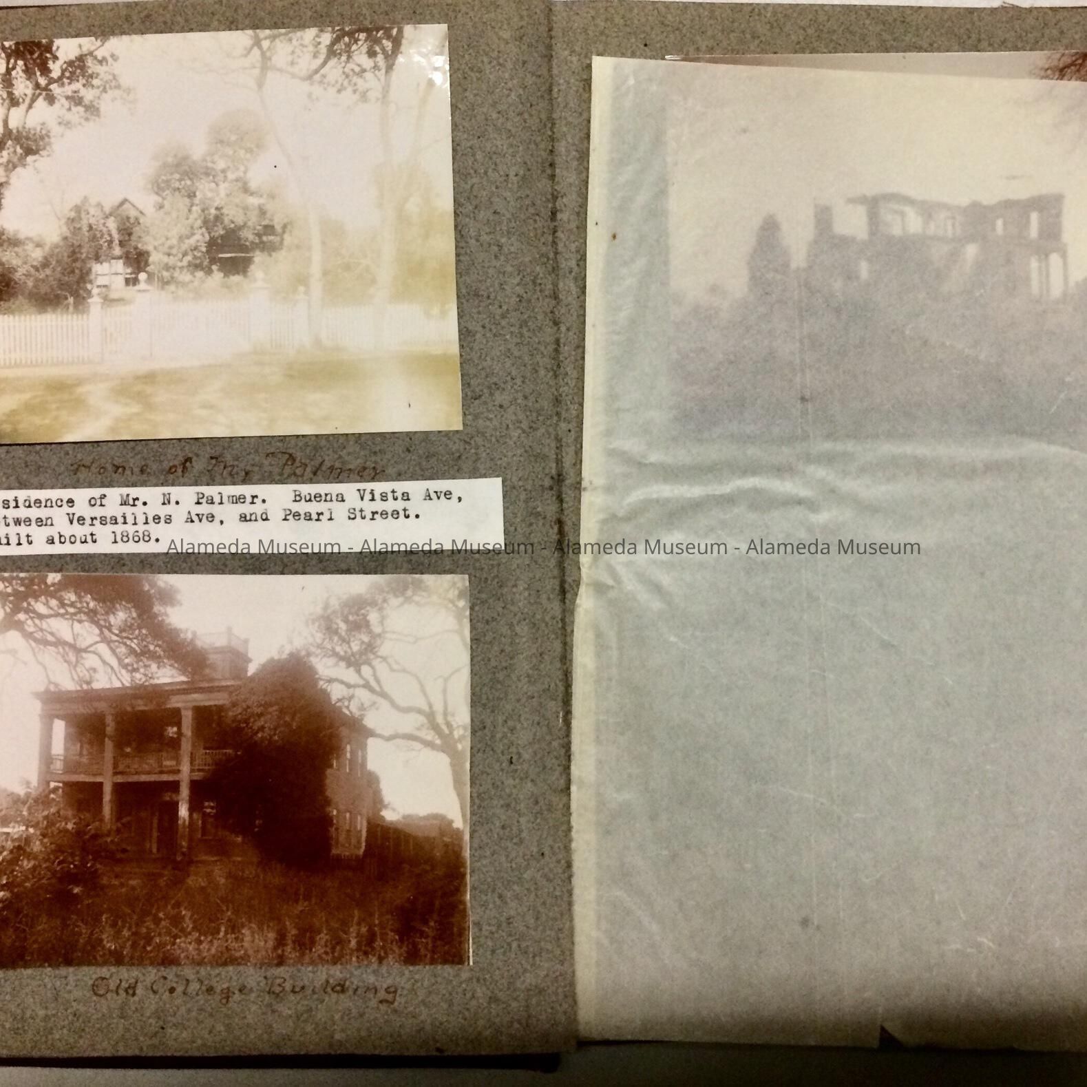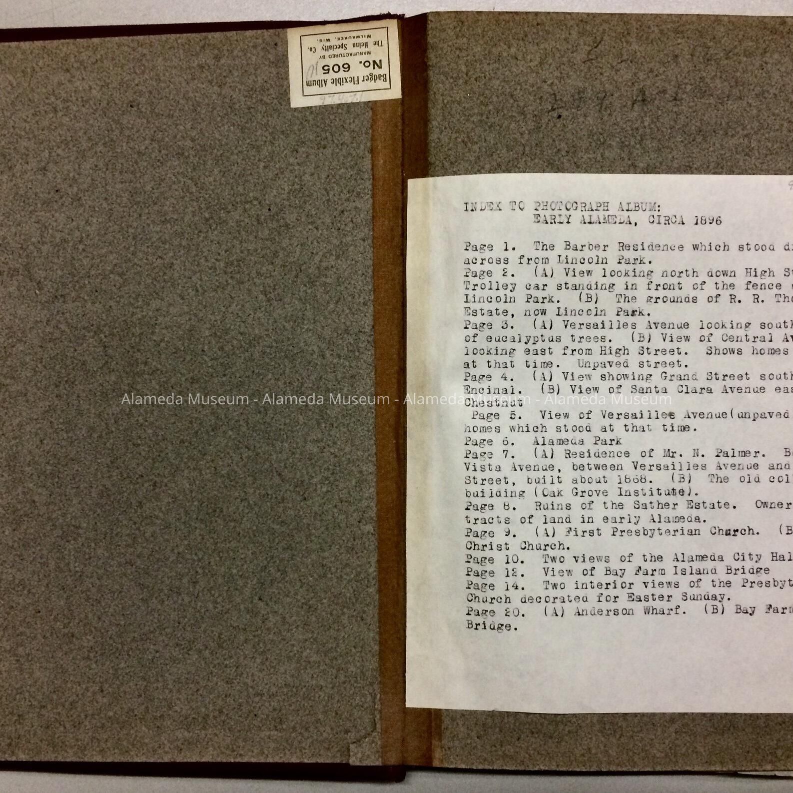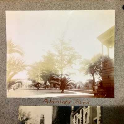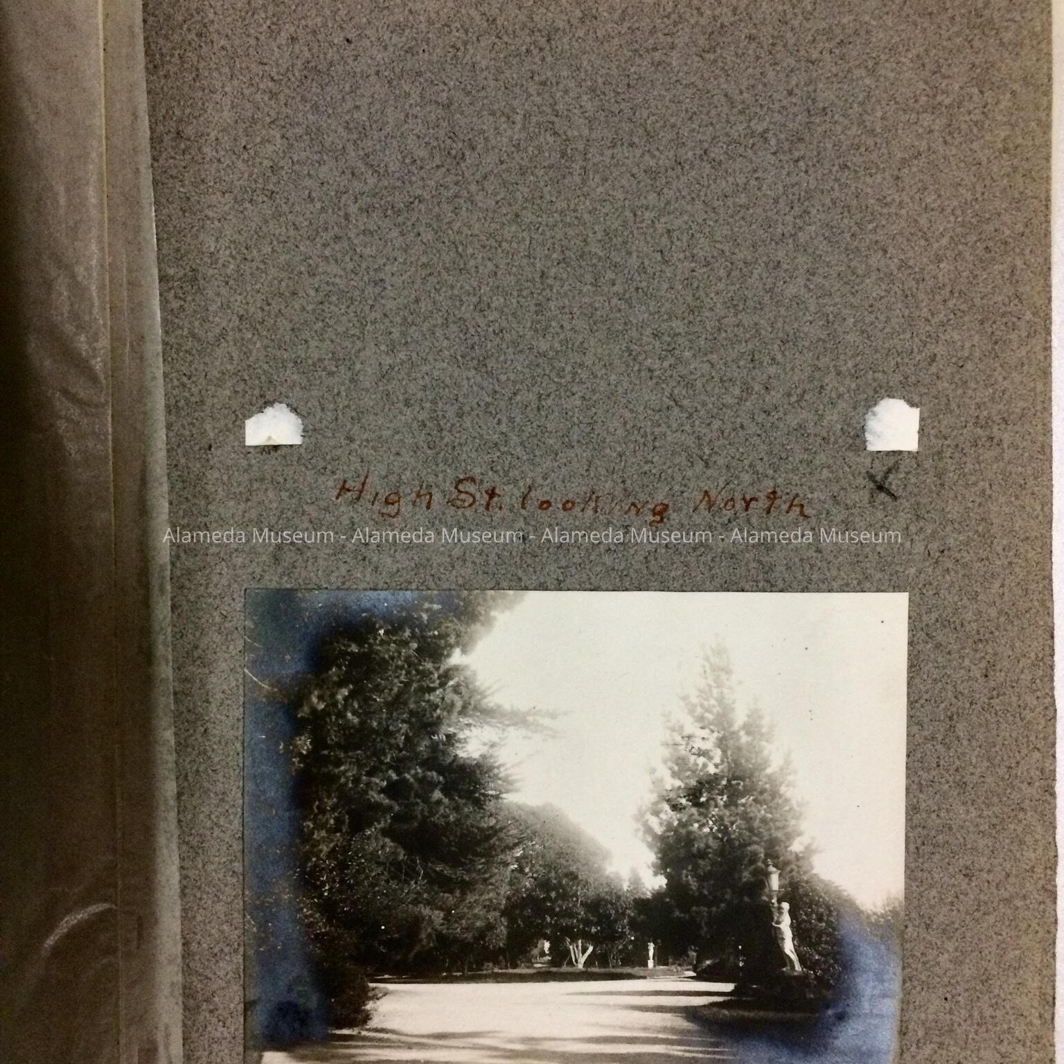 PHOTOGRAPH ALBUM CONTAINING VIEWS OF ALAMEDA IN THE LATE 1890'S AND EARLY 1900's. THE ALBUM INCLUDES PHOTOGRAPHS OF VERSAILLES AVENUE, CENTRAL AVENUE (3200 BLOCK), LINCOLN PARK, PRESBYTERIAN CHURCH, AND CITY HALL BEFORE 1903. ALSO INCLUDED ARE PHOTOGRAPHS OF EARLY CALIFORNIA. ALBUM IS NUMBERED "3," AND WAS GIVEN TO THE ALAMEDA HISTORICAL SOCIETY PRIOR TO 1971.