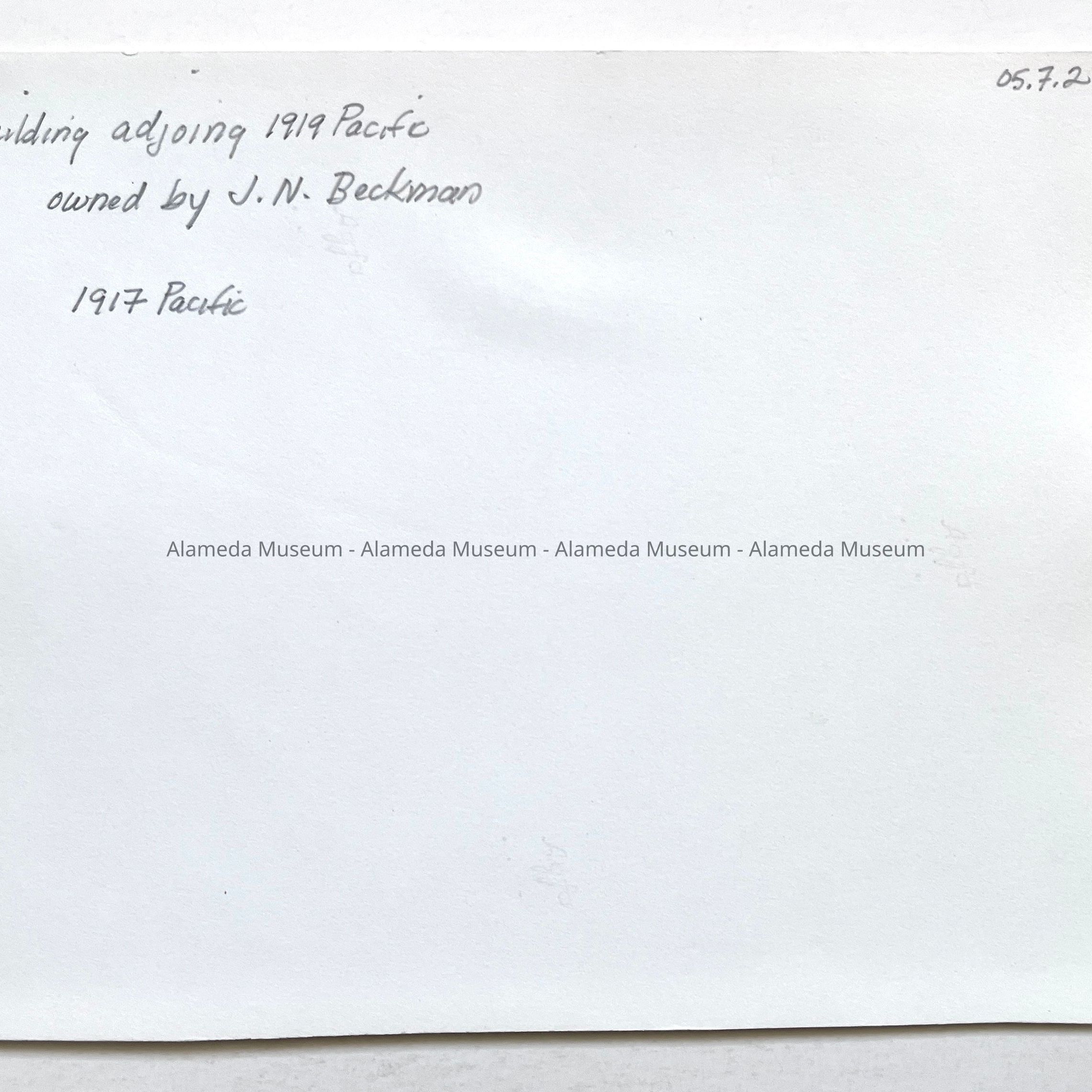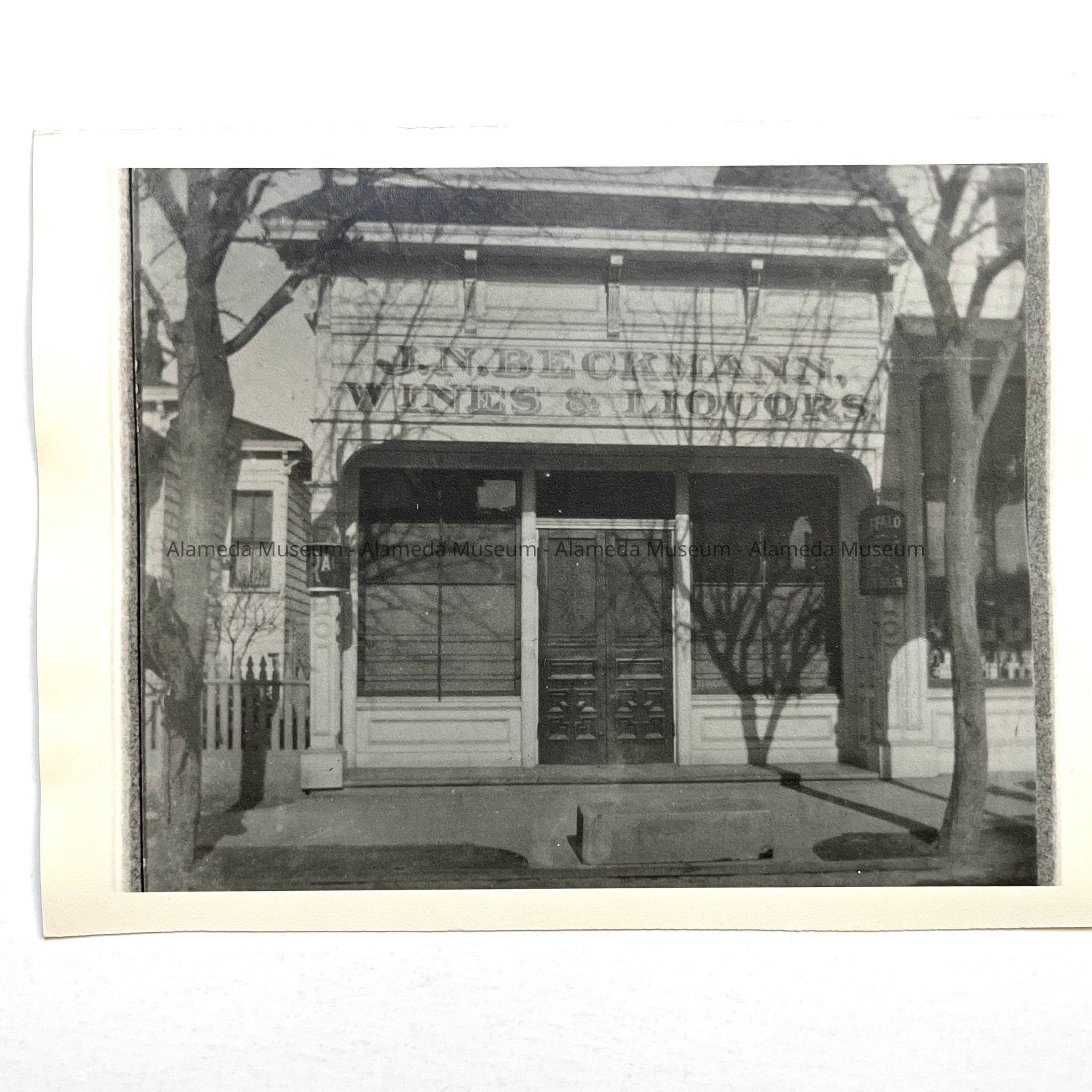 HISTORY OF OBJECT: A PHOTOGRAPH DEPICTING A ONE-STORY FALSE-FRONT STORE, WITH SIGNAGE, "J N BECKMANN, WINES AND LIQUORS." THE BUILDING ADJOINS 1919 PACIFIC AVENUE, ALAMEDA.