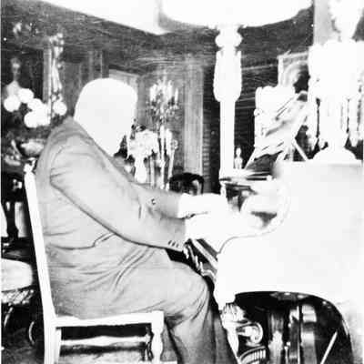 History of Object: Artist Edwin Siegfried seated at the keyboard of Mrs. Richard Chaplin's piano.