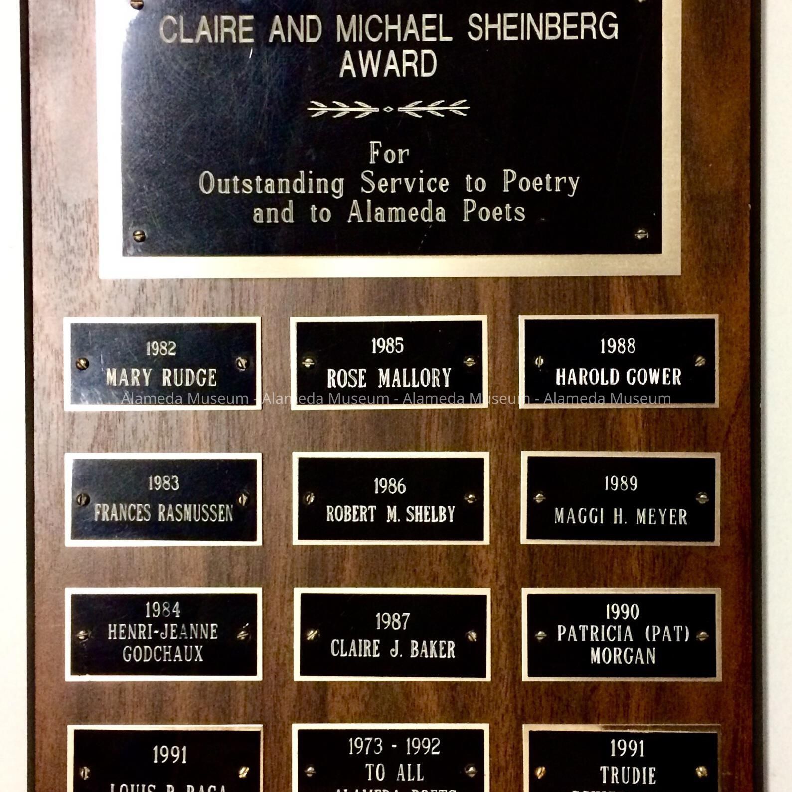 (a) commemorative plaque inscribed "Claire and Michael Sheinberg Award" for outstanding service to poetry and to Alameda Poets from 1982-1991.